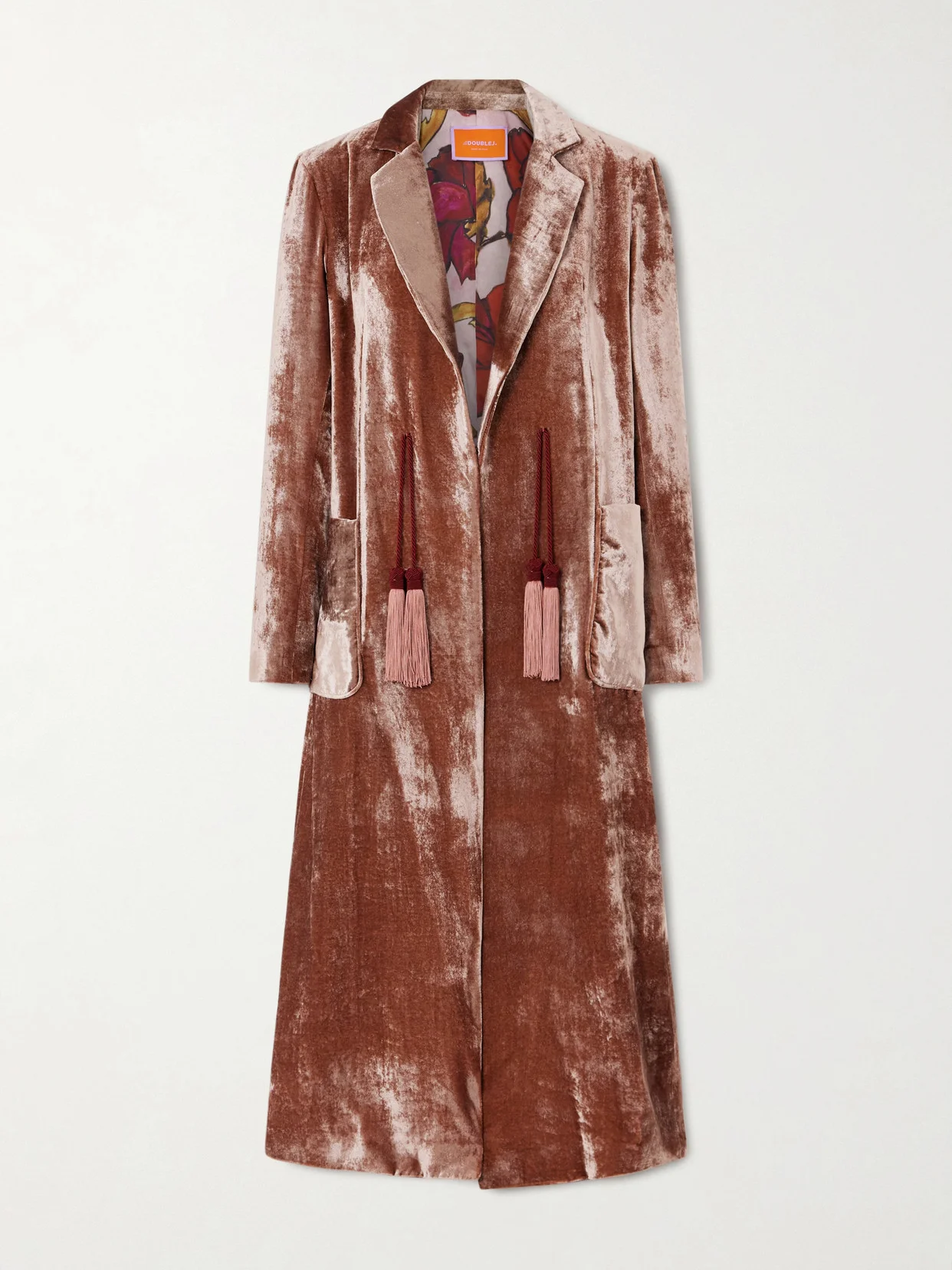 La DoubleJ's coat is a real showstopper. Made in Italy, it's cut from plush velvet in a long, sweeping shape with padded shoulders and smart notch lapels. The tasseled ties add a touch of whimsy.