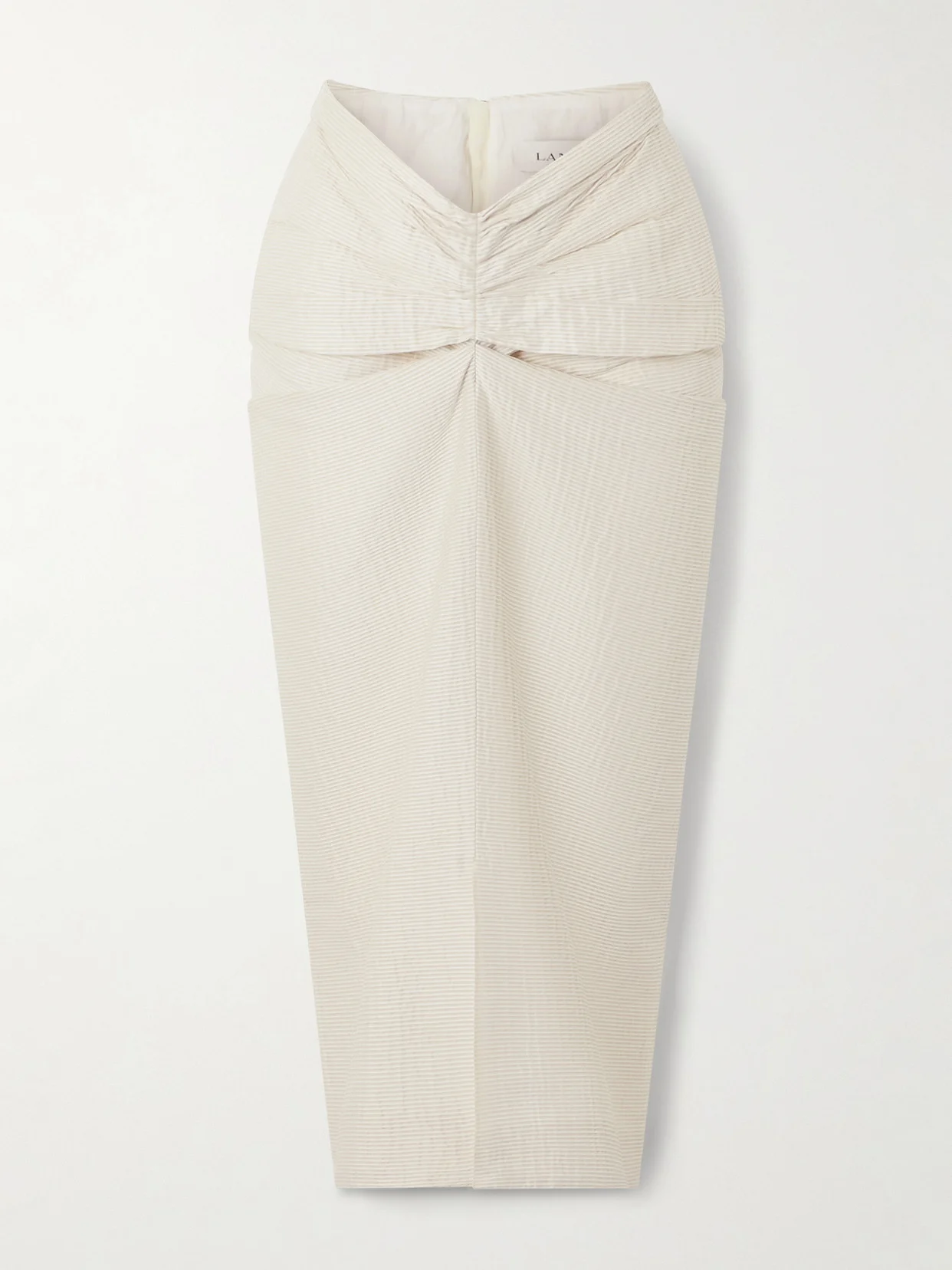 Lanvin's midi skirt is gently gathered at the front, creating a dipped waist and ruching across the hips. It's made from satin that's textured with stripes and cut to skim the figure with a front slit for easy movement.