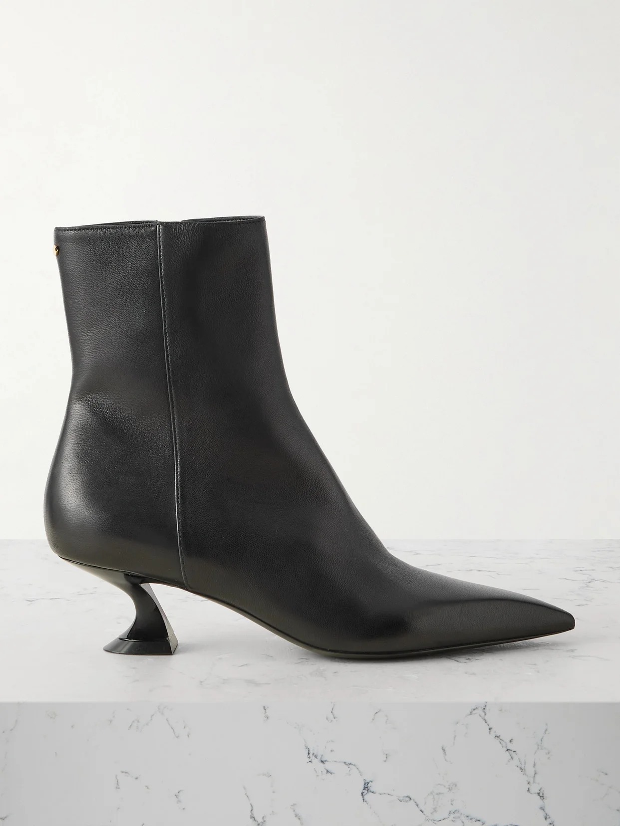 Lanvin's ankle boots are set on a sculptural Art Deco-inspired kitten heels that nod to Jeanne Lanvin's decorative legacy. Made from leather, they have a sleek point-toe shape and subtle gold-tone logo plaque. Opt for hemlines that keep the details in focus.
