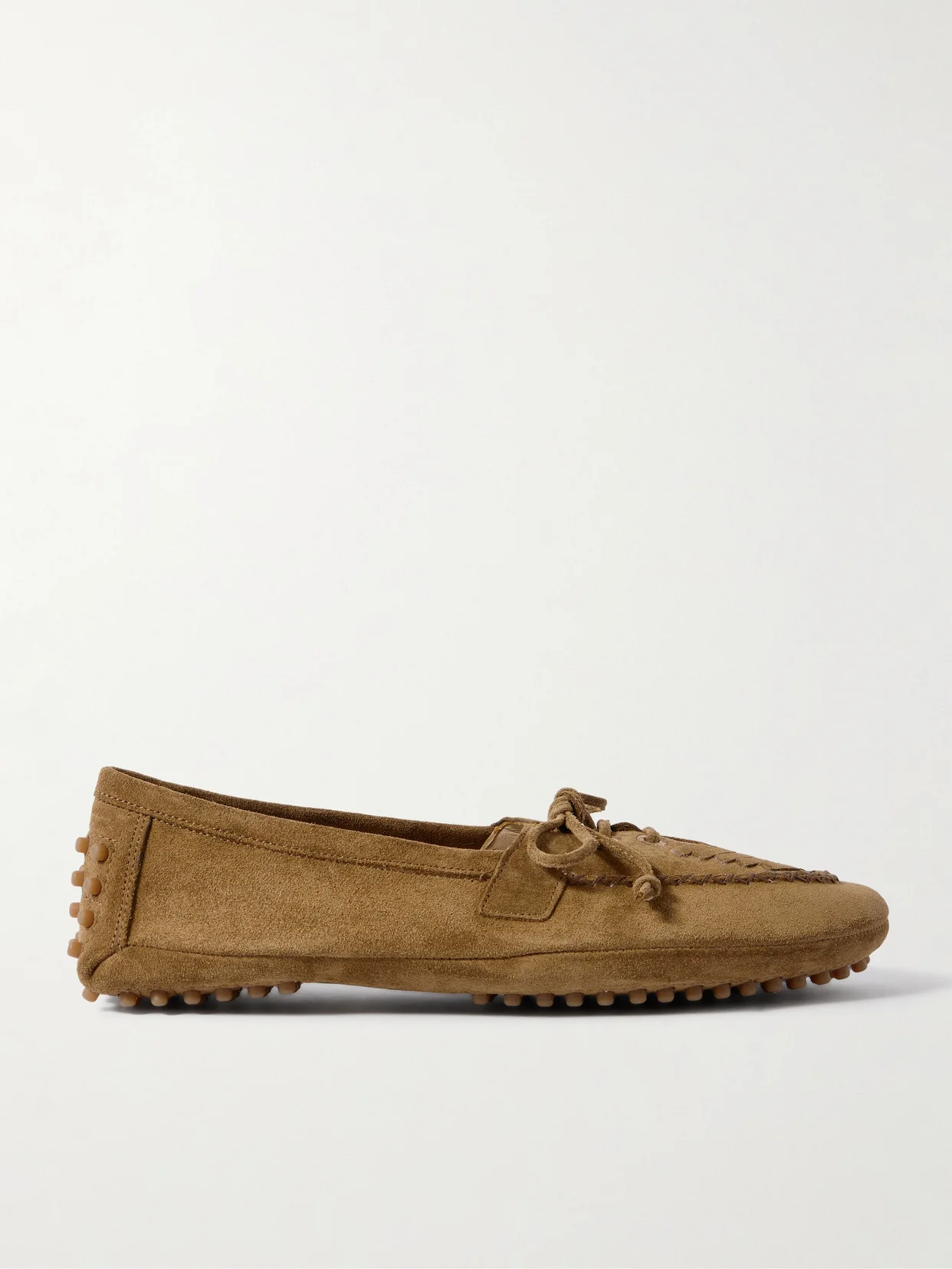 Le Monde Beryl's hand-finished footwear is inspired by "the beauty of things that are designed to last, that look simple but are in fact dense in thought, details and consideration". These loafers are made from suede and have lace-up elements and neat ties. The pebbled soles are borrowed from driving styles.