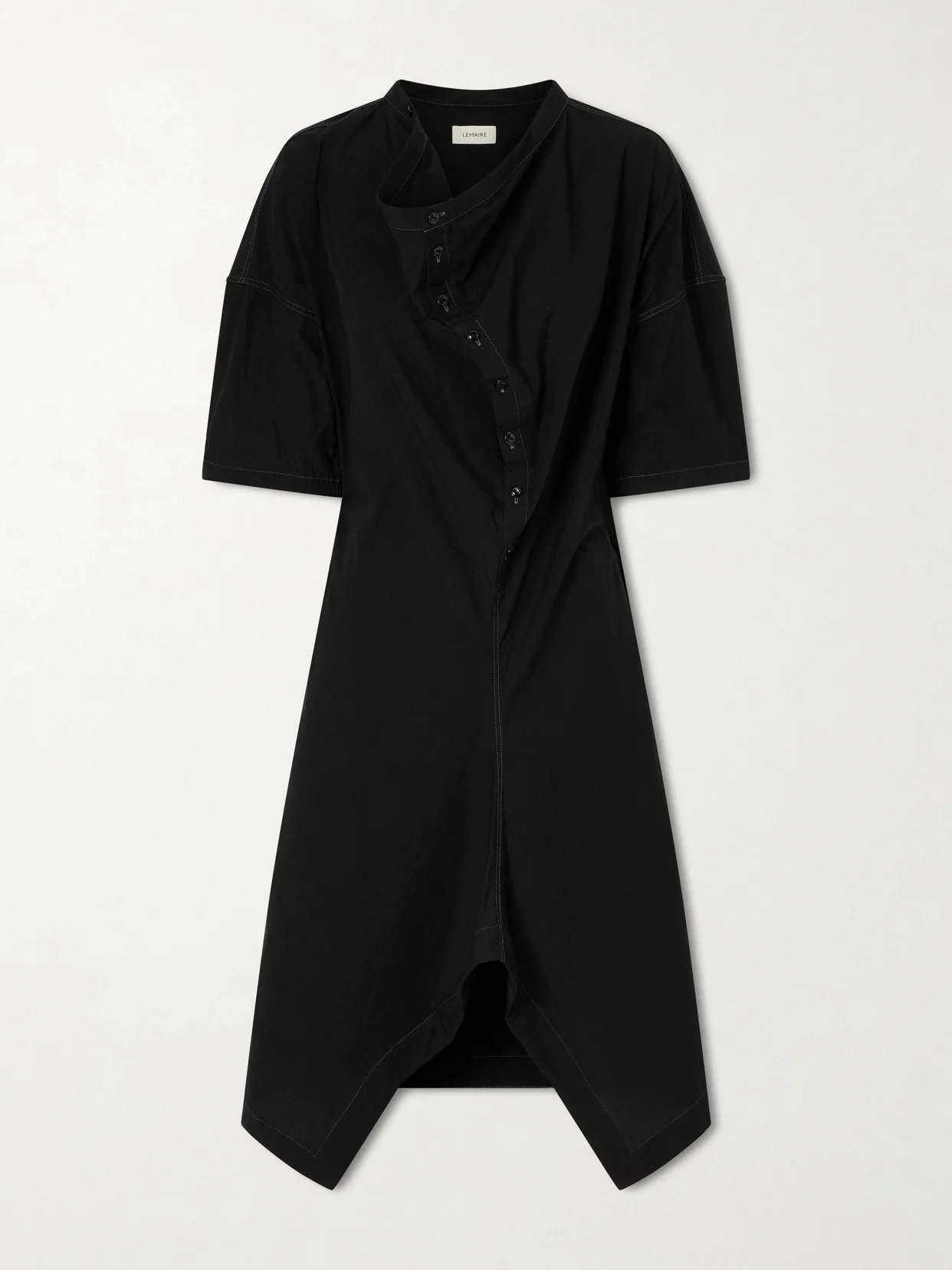 Lemaire's dress uses asymmetry and buttons to create sculptural lines. Made in Portugal from cotton-crepe, it has a cowl neckline, gently puffed sleeves, and an asymmetric hem. Style it with a silk scarf at the neck. Lower-Impact Materials. This product is made using at least 50% lower-impact materials or ingredients. Find out more about our NET SUSTAIN criteria here.