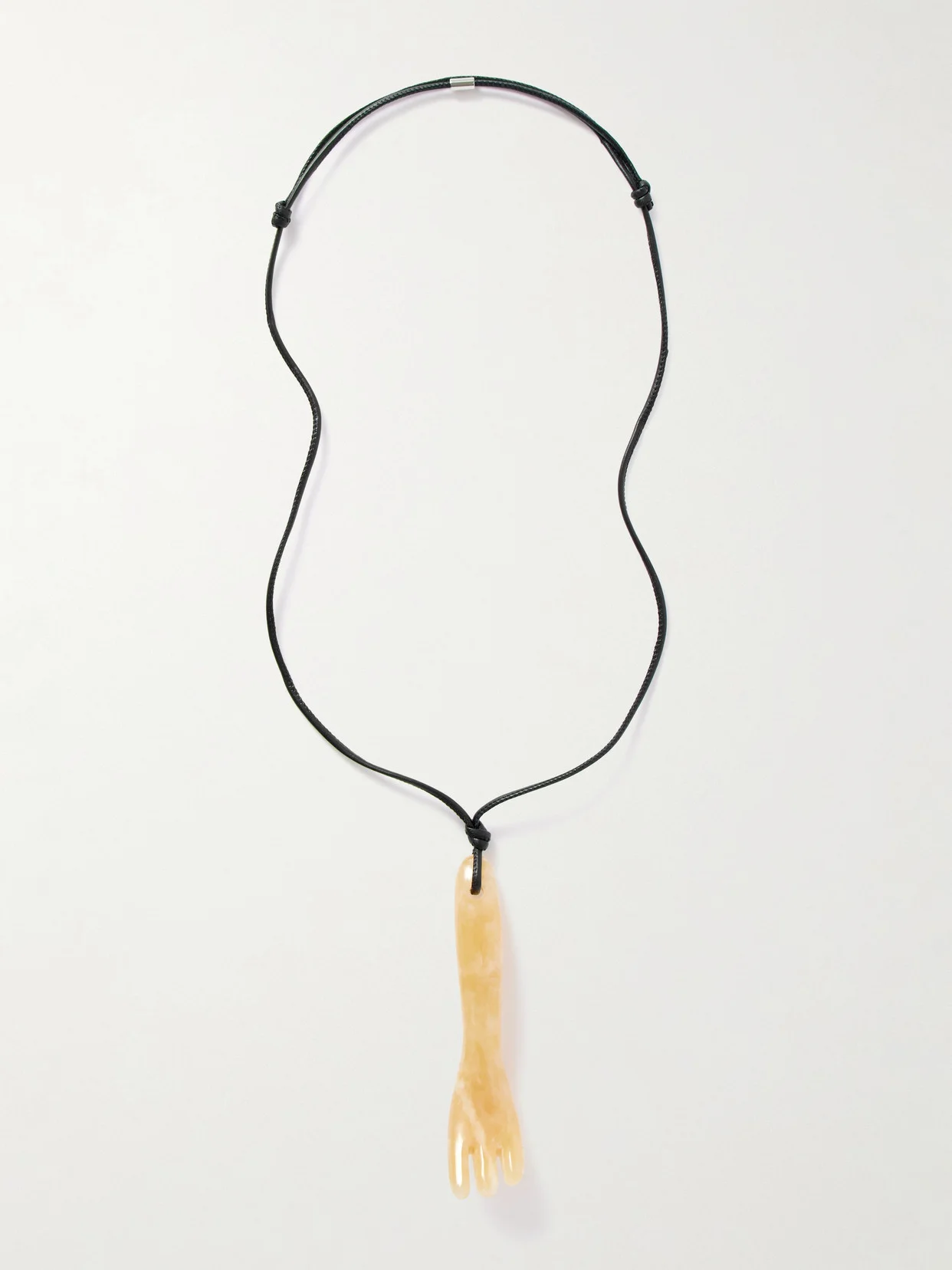 Lemaire's 'Gua Sha' necklace transforms a traditional wellness tool into a sculptural statement. Each piece is unique and hand-carved from semi-precious stones. It's suspended on a leather cord to evoke natural forms and understated elegance.