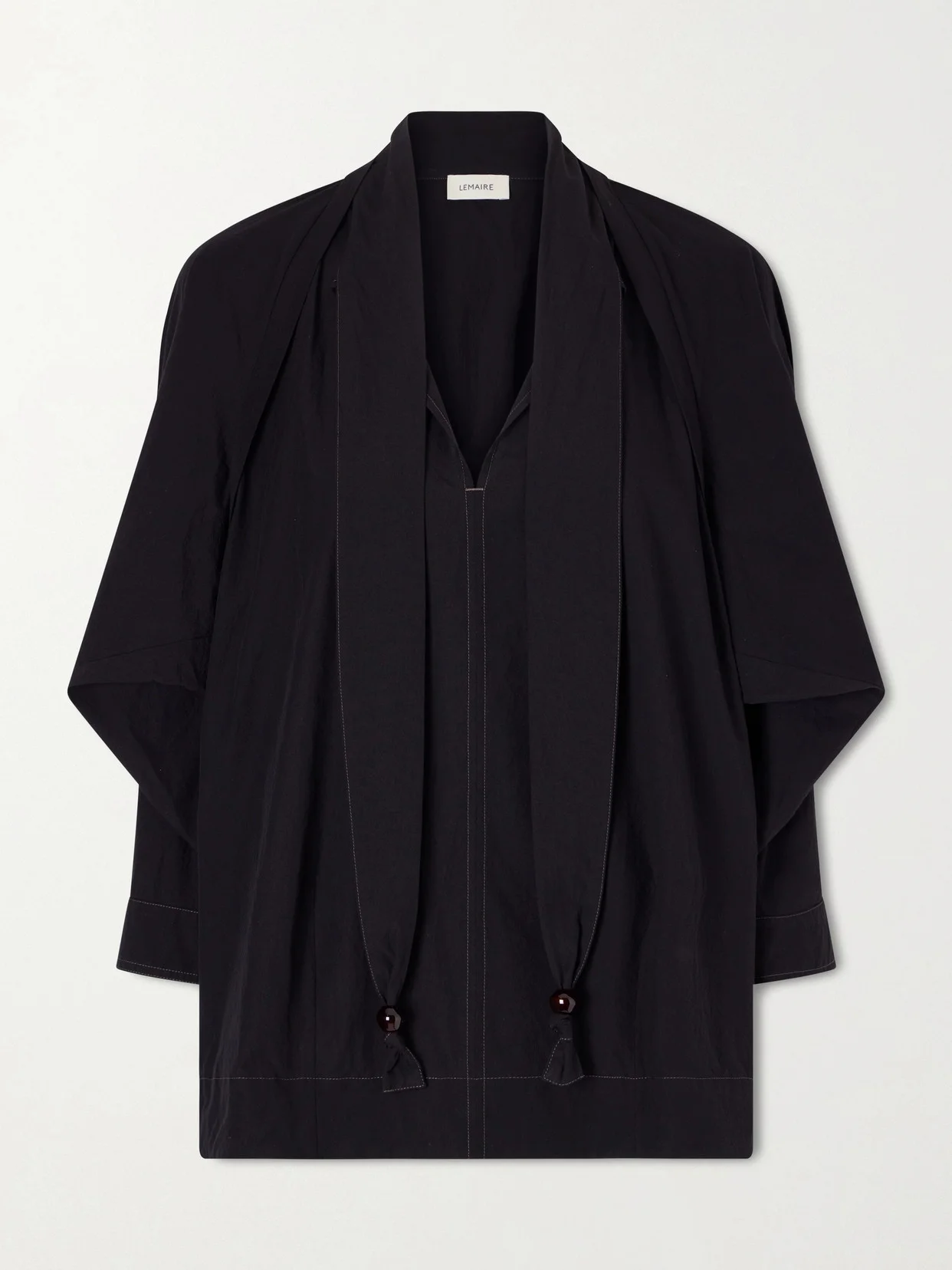 The bead-embellished scarf ties lend an effortless charm to Lemaire's blouse. Made from crinkled cotton-crepe, it's detailed with contrast topstitching and has a boxy, loose shape with three-quarter raglan sleeves. Tuck yours into high-waisted jeans or pants. Lower-Impact Materials. This product is made using at least 50% lower-impact materials or ingredients. Find out more about our NET SUSTAIN criteria here.
