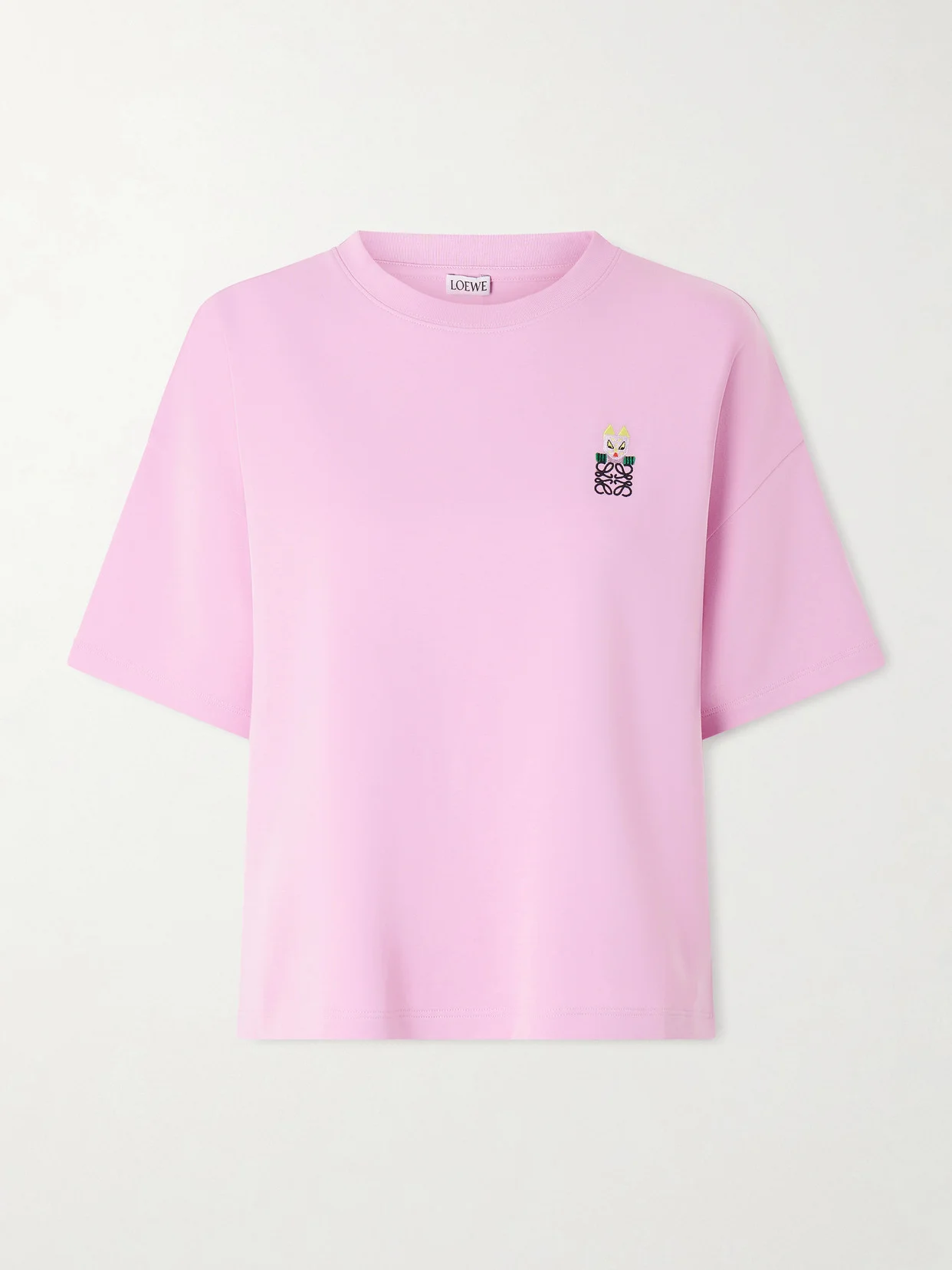 Loewe celebrates British artist Louis Wain for Spring '26, who was known for his whimsical depictions of cats. This T-shirt is made from cotton-blend jersey and embroidered with the house's 'Anagram' and a kitty on top.