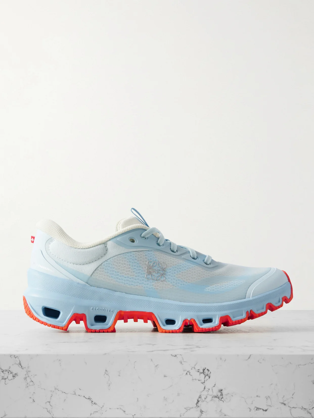 Loewe reunites with ON for a second iteration of the 'CLOUDVENTURE' sneakers, blending high-performance design with the brand's signature craftsmanship. Made from panels of breathable recycled-mesh reinforced by rubber trims, it has signature textured soles for traction and cushioned collars to ensure comfort. Both brands' logos are featured on the sides.
