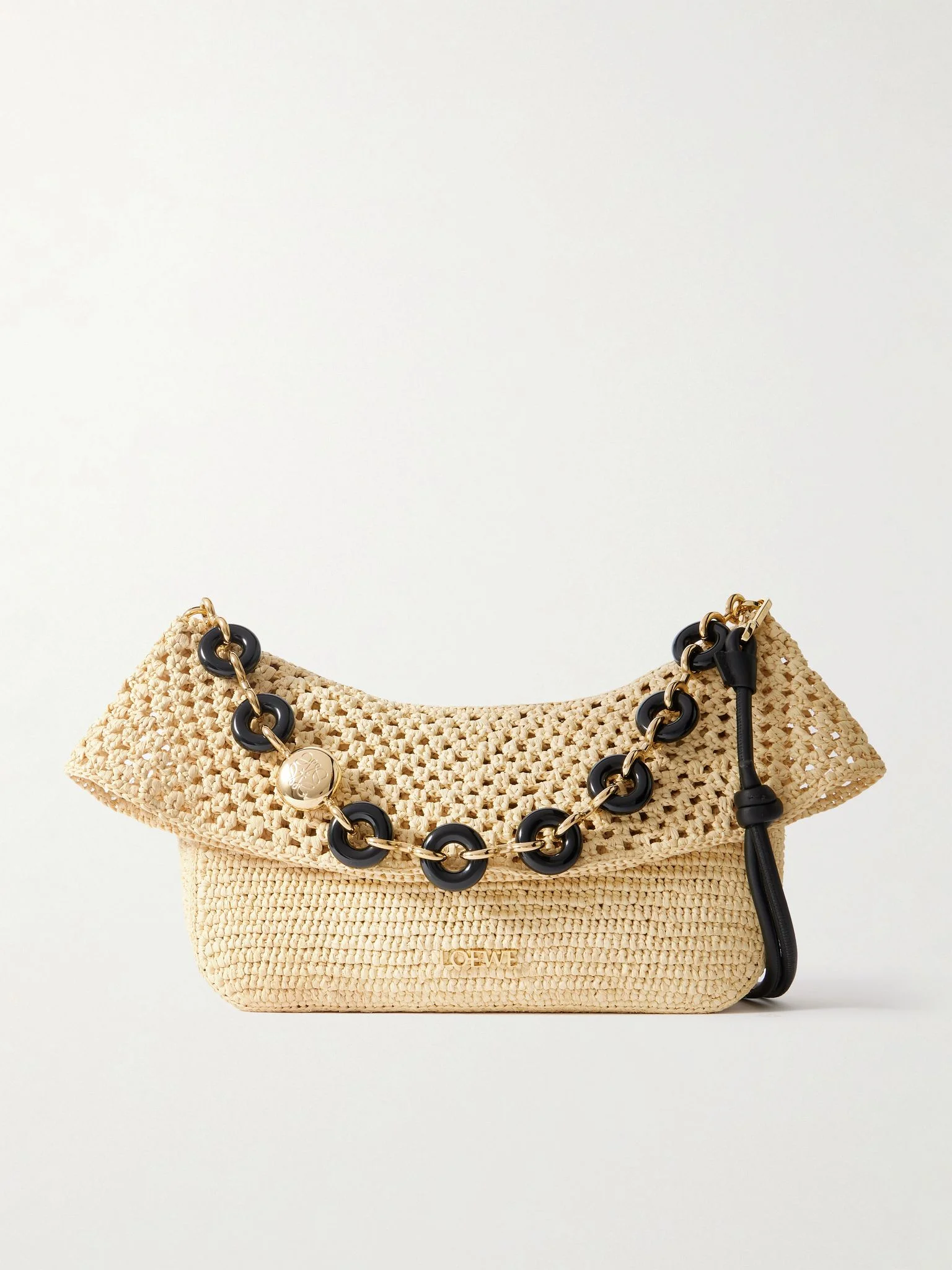 Woven from raffia, Loewe and Paula's Ibiza's small 'Ola' shoulder bag is adorned with an 'Anagram'-engraved gold-tone 'Donut' strap and has a longer detachable leather strap, so you can go hands-free. Inside you'll fit your phone, cardholder and sunglasses. Details & Care - Raffia, black leather - Chain strap, detachable shoulder strap - Internal slip pocket - Unlined - Fold-over top - Comes with a dust bag - Weighs approximately 2.2lbs/ 1kg