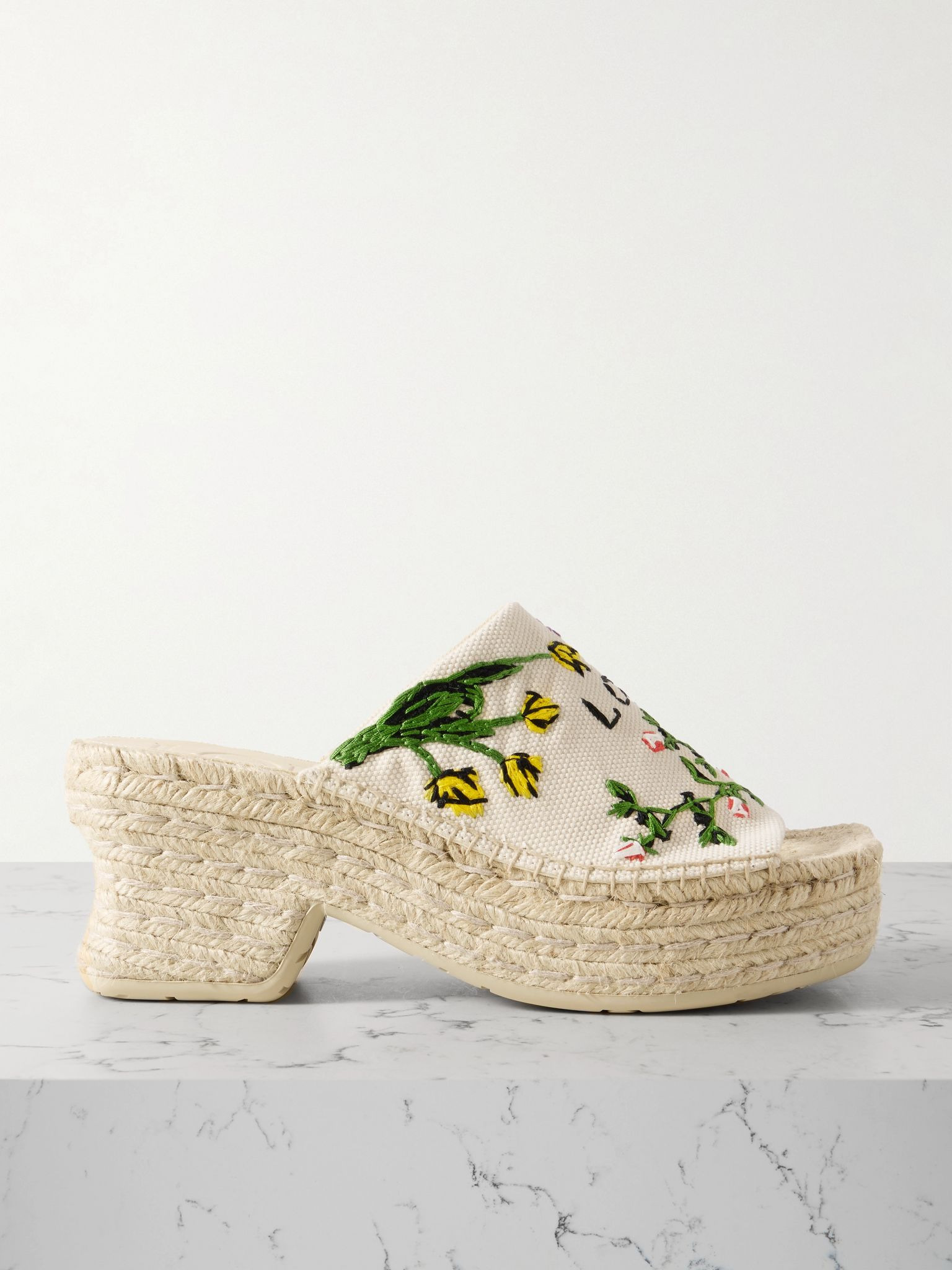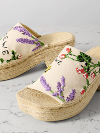 The free-spirited energy of the Balearic Islands fuels Loewe and Paula's Ibiza's ongoing collaboration. These espadrille mules are made from canvas that's beautifully embroidered with flowers, bees and the label's logo. The handmade jute wedge soles are balanced with a generous platform. Size & Fit - Fits true to size, take your normal size - Only available in full sizes, go up to the nearest whole size if you take a half size - Italian sizing Details & Care - Heel measures approximately 75mm/ 3 inches with a 40mm/ 1.5 inch platform - Multicolored canvas - Slip on