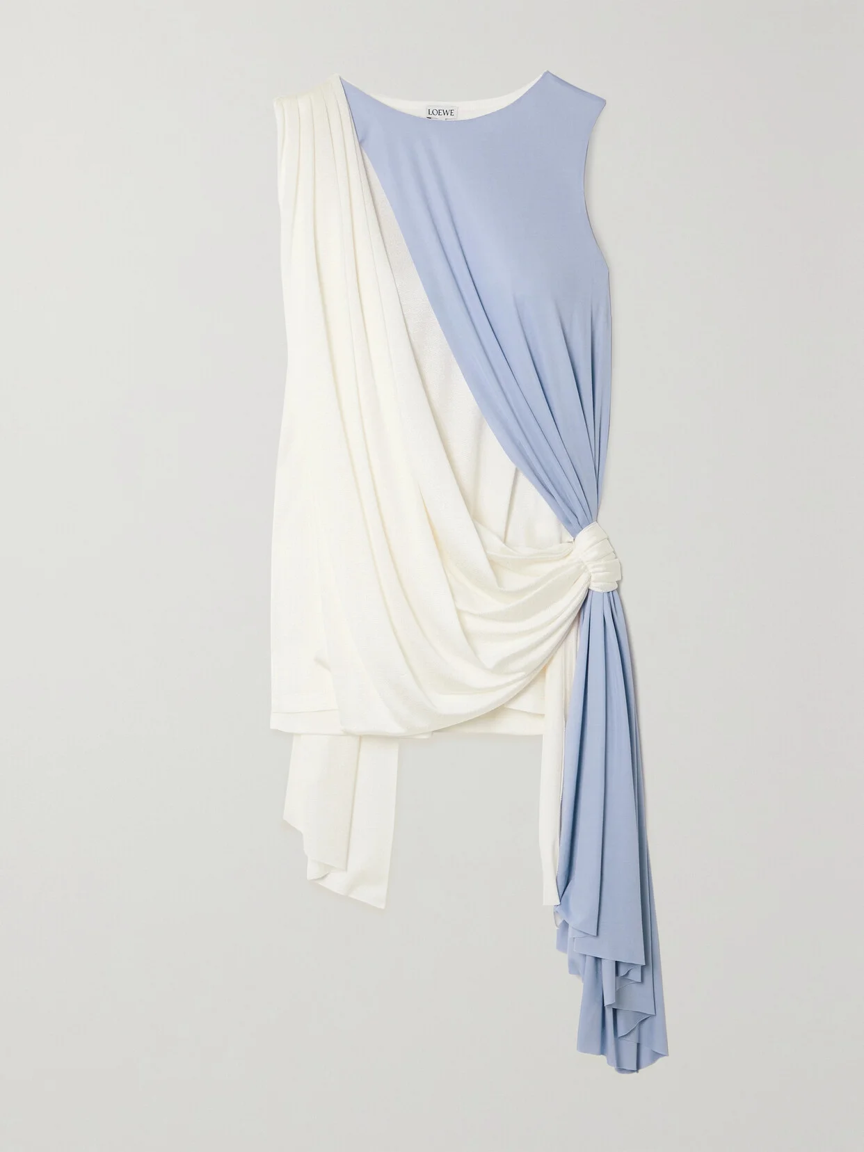 Jonathan Anderson was partly inspired by the picture of 'The Deposition from the Cross', painted by Jacopo Pontormo in 1528 for Loewe's Spring '22 collection, which led to the light-blue hue and beautiful draping on this top. It's made from silk crepe de chine and has an asymmetric panel at the front that knots at the waist and hangs loosely to one side.