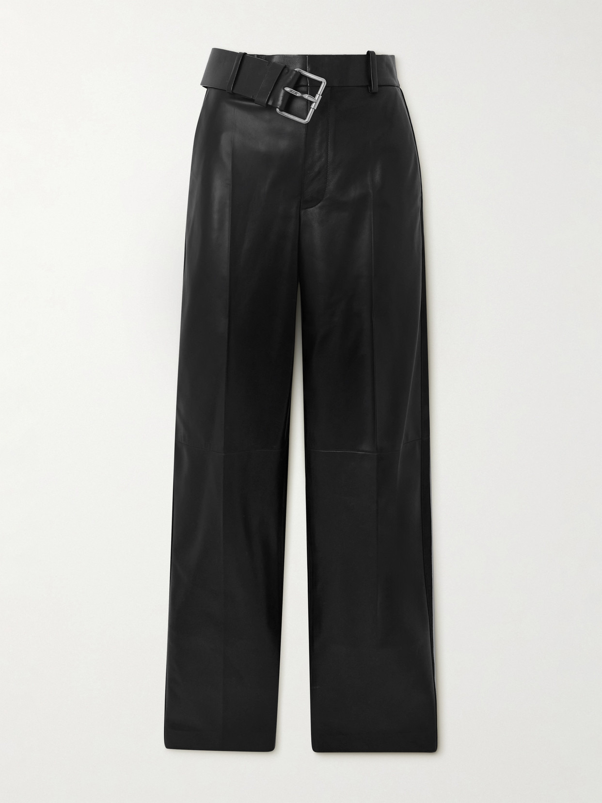 Loewe's Fall '24 collection debuted to a backdrop of paintings by American artist Albert York which had served as inspiration for the clothing. Worn on the runway, these pants are made from panels of supple leather for a straight-leg fit and feature a partial belt that spans halfway along the waist to appear purposely undone.
