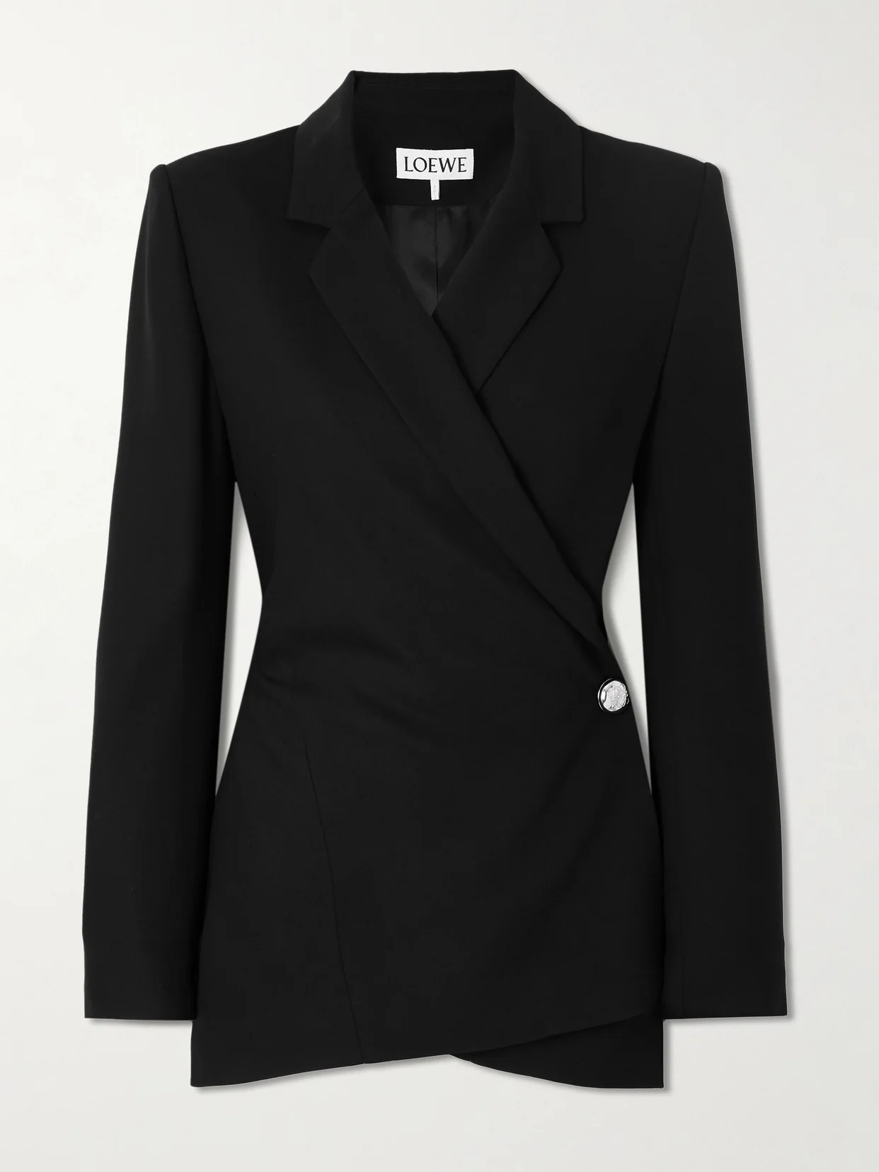 Loewe's affinity for experimental proportions results in contemporary staples like this blazer. It's tailored from crepe in a wrap design that fastens with adjustable ties and a silver-tone button featuring the 'Anagram'. Padded shoulders add structure.
