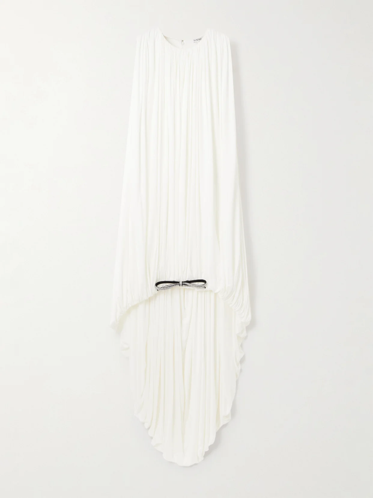 Loewe plays with dramatic proportions in this sculptural dress, defined by a graduated bubble hem and a crystal-embellished suede bow. It's made from silk-jersey that drapes beautifully over your frame in soft folds.