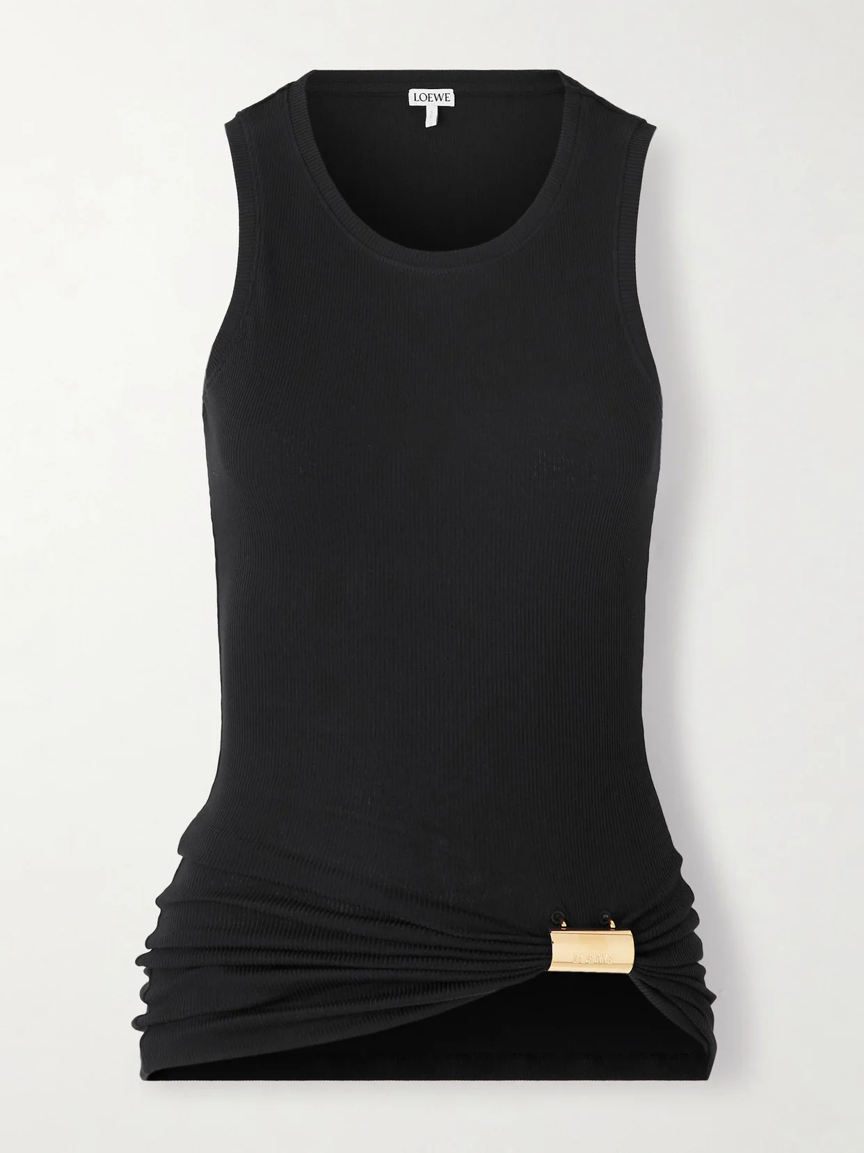 Loewe's tank is punctuated with a gold-tone, logo-engraved embellishment that cinches the hem into a curved, gathered shape. It's made from cotton-blend jersey with a ribbed finish that enhances the slim fit.