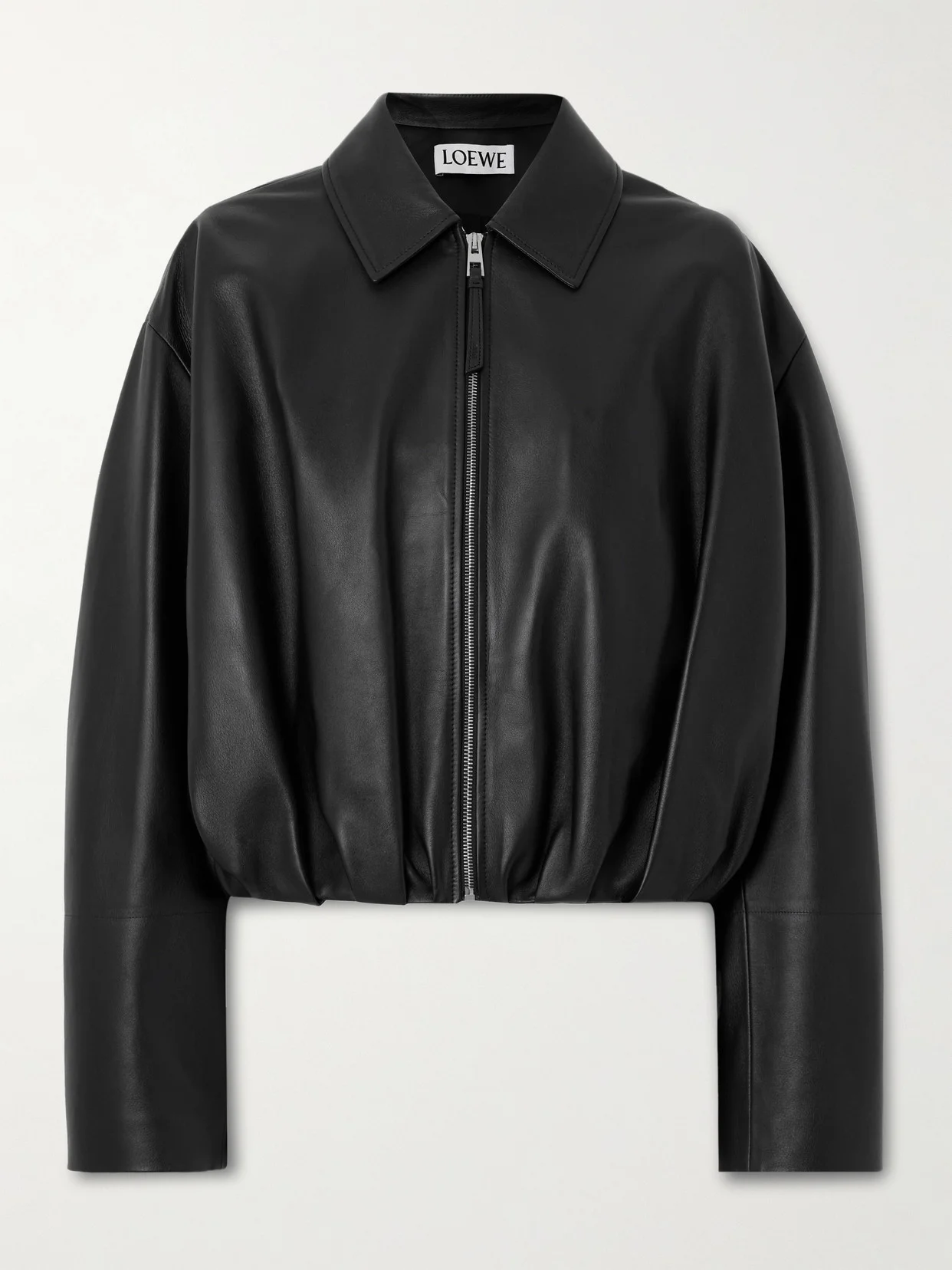 Loewe's jacket is gathered along the back, giving it a voluminous, balloon-inspired shape. It's made from soft leather and has a loose fit.