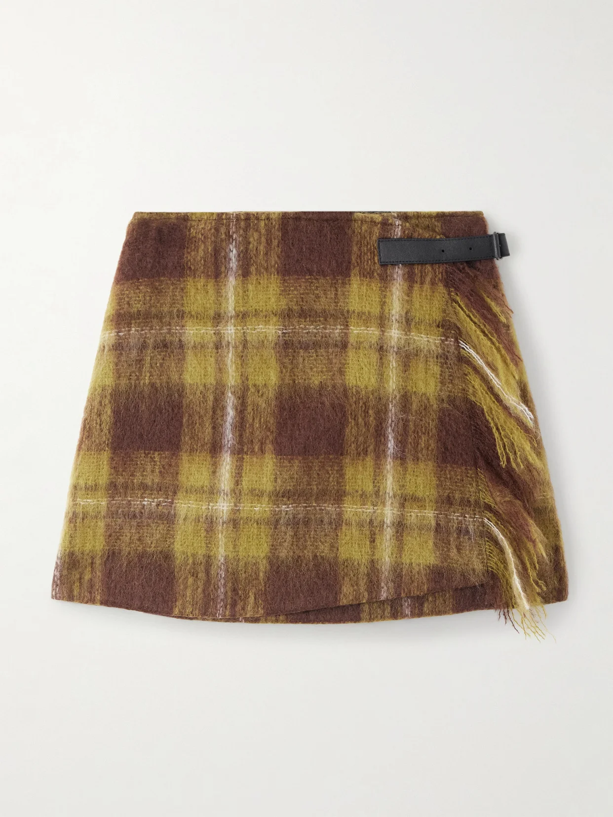 Loewe's skirt can be compared to one of its signature fuzzy scarves. Made from a checked mohair and wool-blend, it has a wrap-effect front with fringed edges and a buckled leather tab.