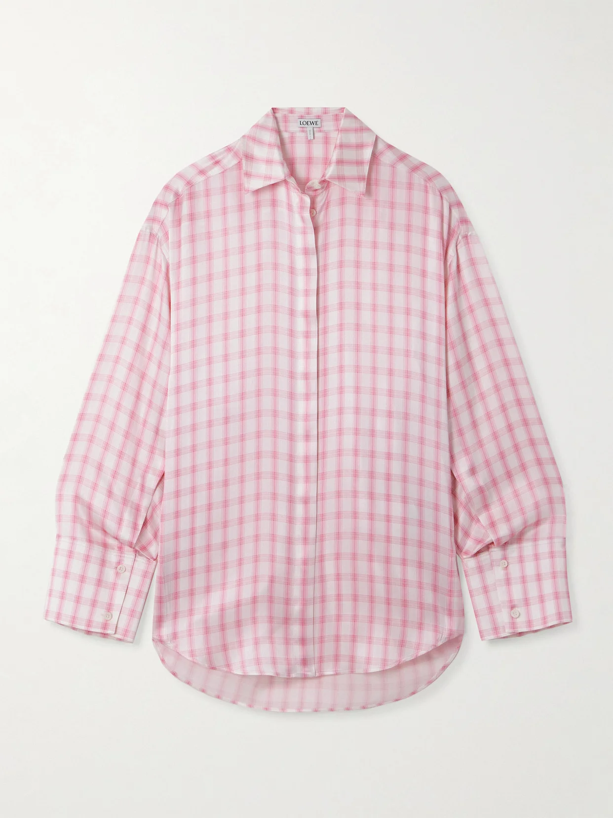 Loewe's shirt is made from silk that's decorated with tonal-pink checks. It's designed for an oversized fit and has a neat collar and classic buttoned cuffs - roll them up to create a laid-back take. The signature 'Anagram' is embroidered at the back.