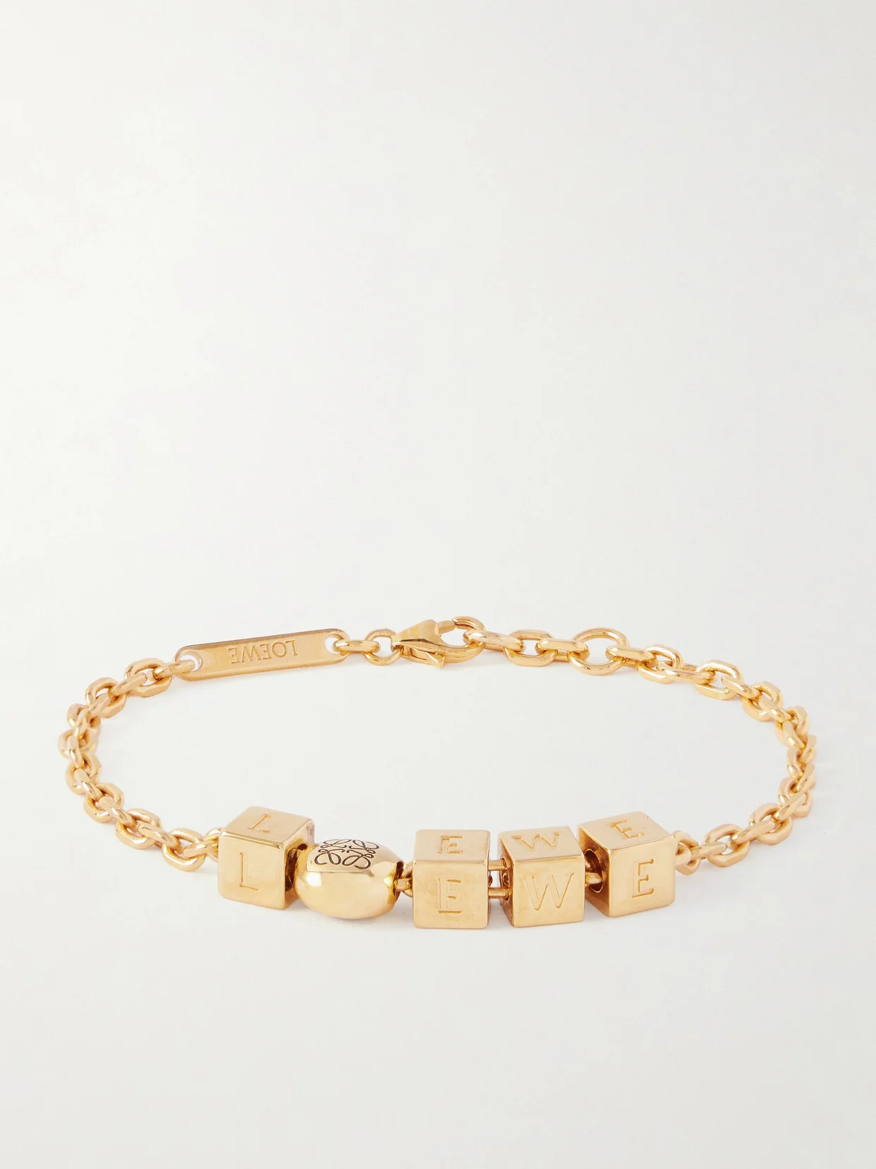 Loewe finds artful ways to celebrate its legacy, like this bracelet cast from gold-plated silver and strung with lettered cubes that spell out the moniker. At the center, a pebble-shaped bead is etched with the signature 'Anagram' - a subtle nod to the brand's storied heritage.