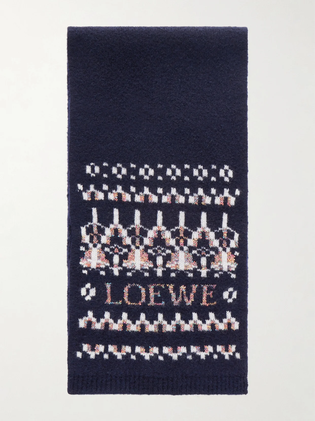 Loewe's scarf is knitted with a charming Fair Isle pattern that shimmers with dainty multicolored sequins. It's made from soft and insulating wool-blend and has ribbed trims so it'll hold its shape.