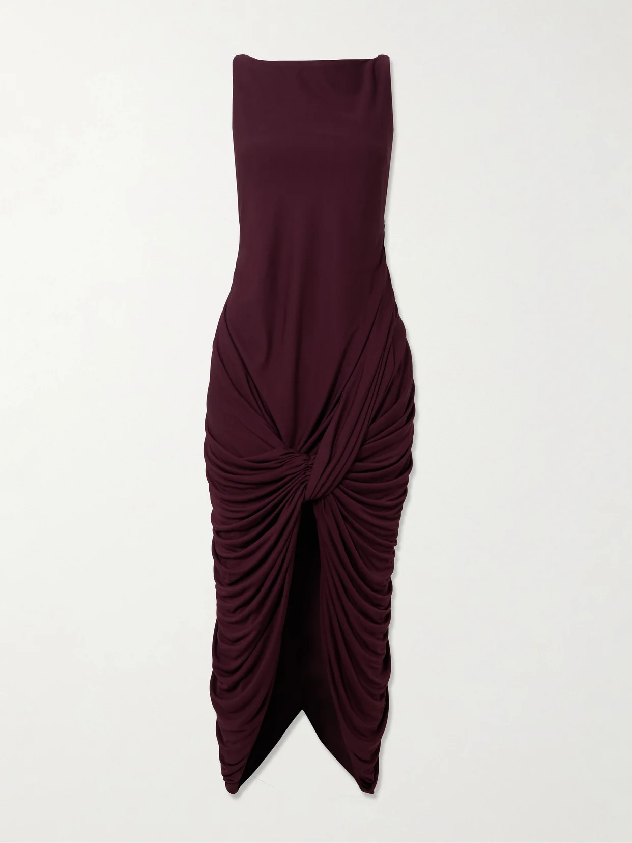 Loewe's dress is artfully twisted at the front, creating a beautiful gathered texture and a high, skin-baring slit. It's made from slinky burgundy jersey with an elegant boat neckline. Style yours with sculptural accessories.