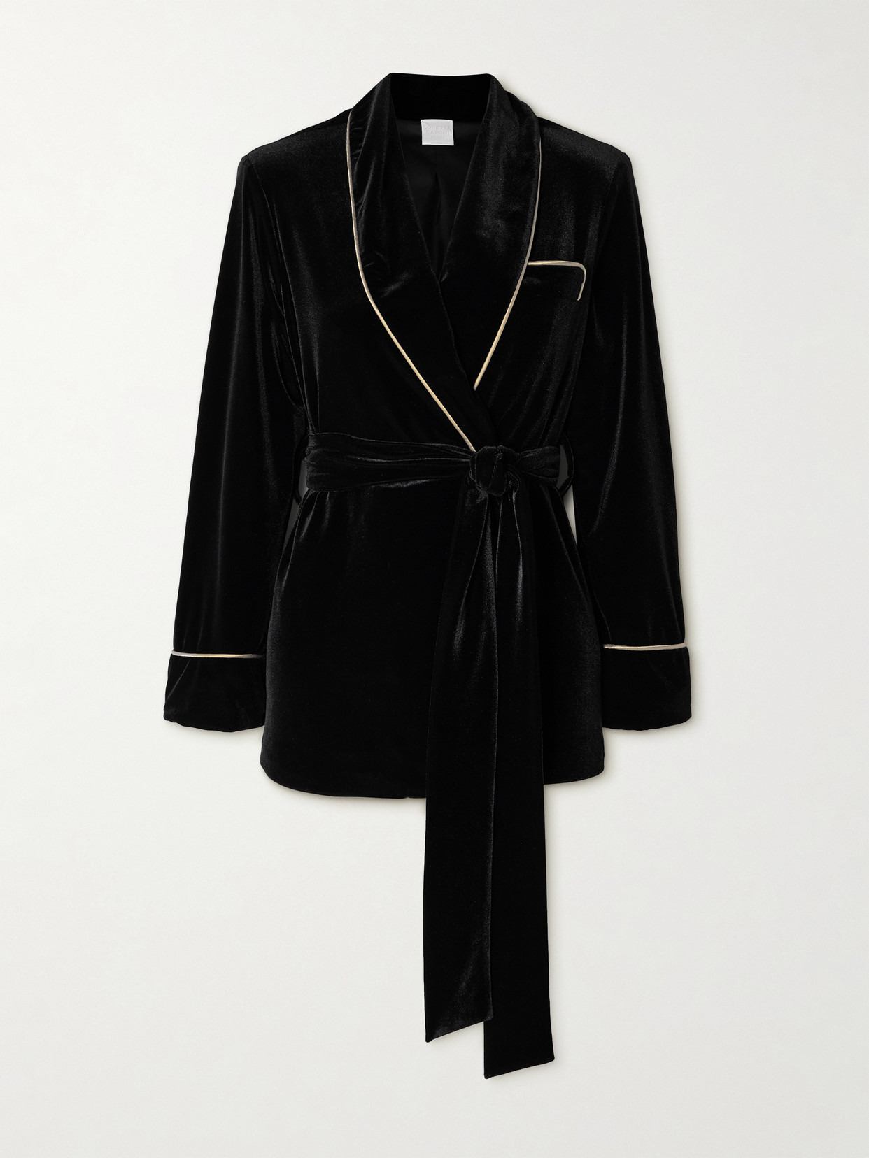 Loretta Caponi's 'Nora' robe looks equally chic with tonal tailoring or inky jeans. It's handmade from plush velvet and has gold satin piping outlining the shawl collar, chest pocket and cuffs. Use the detachable belt to cinch the shape.
