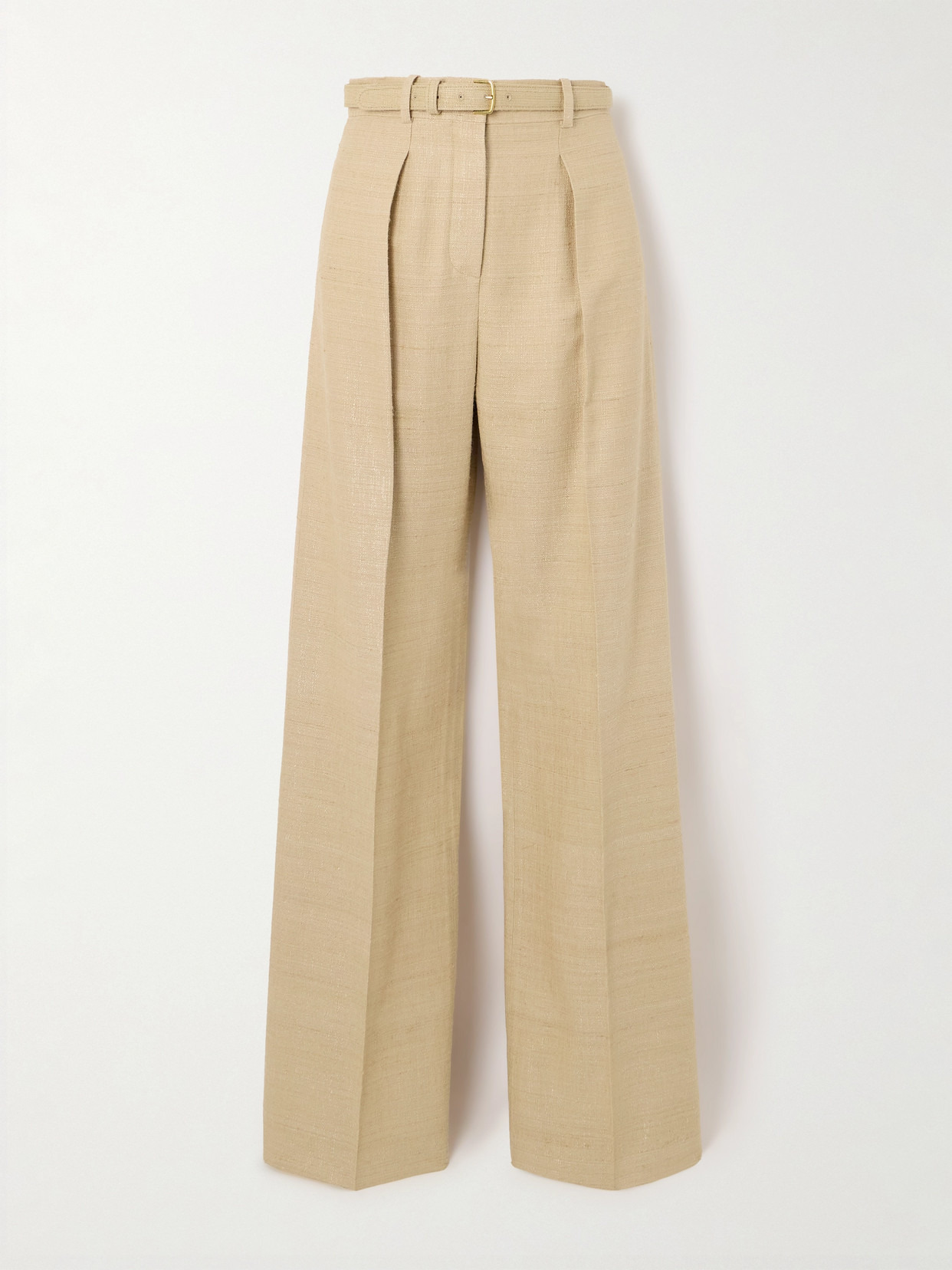 Edward Belted Pleated Raw Silk Wide-leg Pants