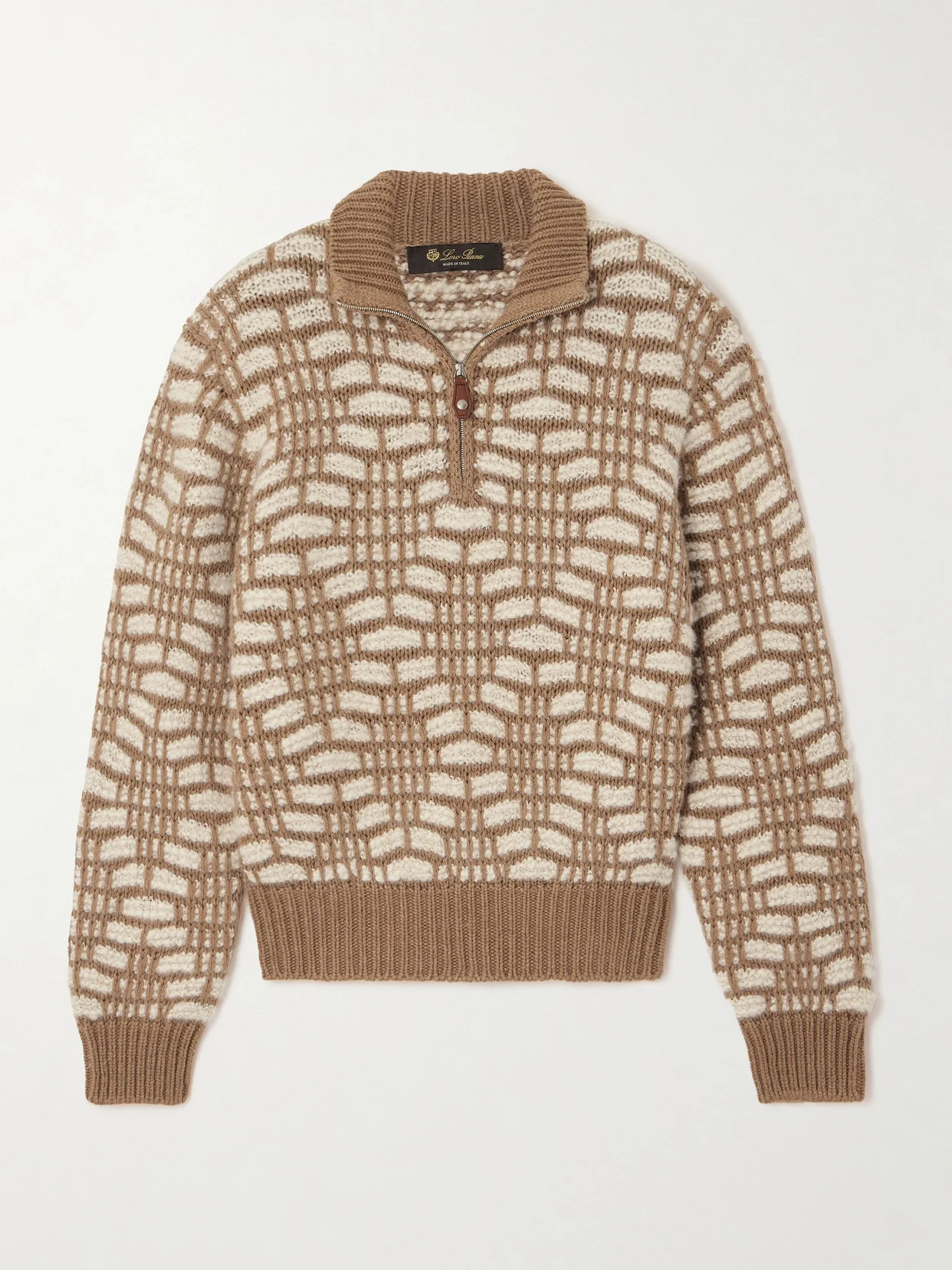 Loro Piana's weighty sweater is intricately jacquard-knitted from camel hair in a neutral geometric motif. It's designed for a slightly loose fit and has tapered ribbed trims. The leather zip pull stays true to the brand's reputation for quality down to the details.