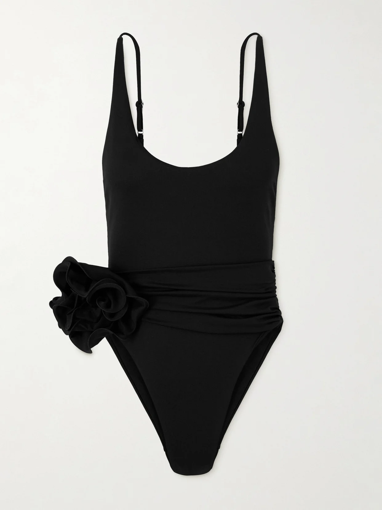 Magda Butrym's swimsuit features the label's signature rosette appliqued just above the hip. It's made from stretch fabric that's ruched to enhance your natural curves and has high-cut legs.