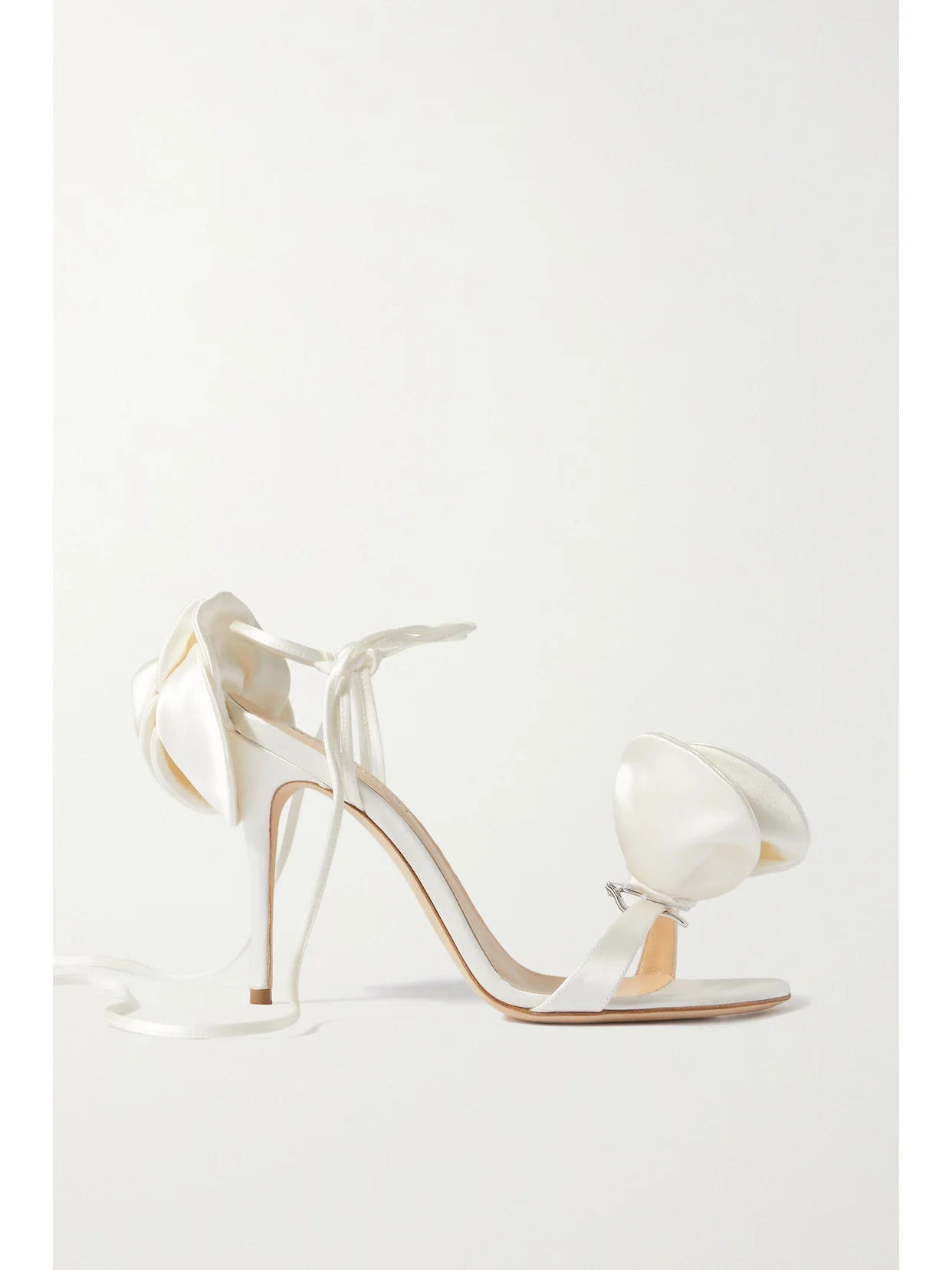Magda Butrym's sandals are such a romantic choice for your wedding day. Crafted from ivory satin, they're poised on elegant stiletto heels and have delicate ankle ties. The beautiful, blooming roses can either be clipped on or removed completely, creating two distinctive looks for the ceremony and reception.