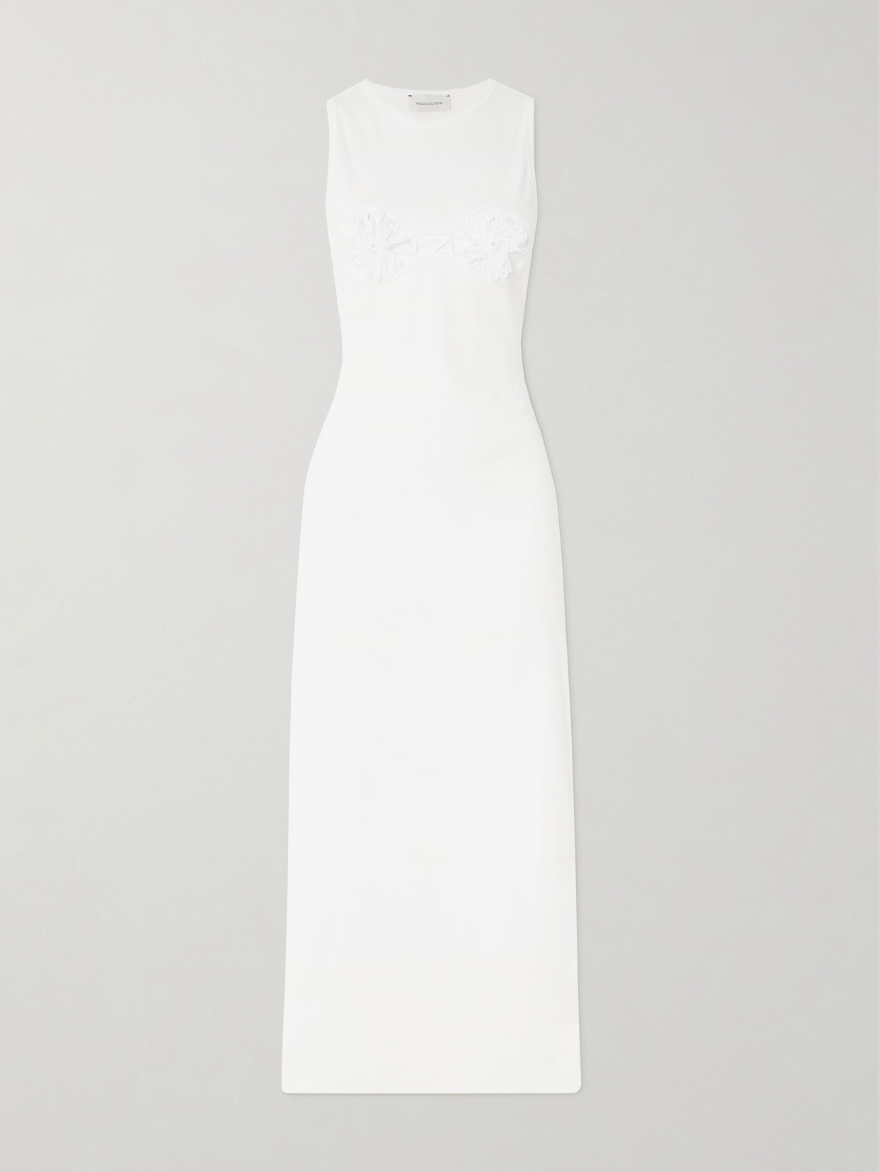 Magda Butrym's Spring '25 "Gossamer" collection features intricate handcrafted crochet details, paying homage to Slavic craftsmanship. This dress is defined by the tactile elements at the bust. It's cut from ribbed stretch-cotton jersey for a slim fit and has a high neckline.