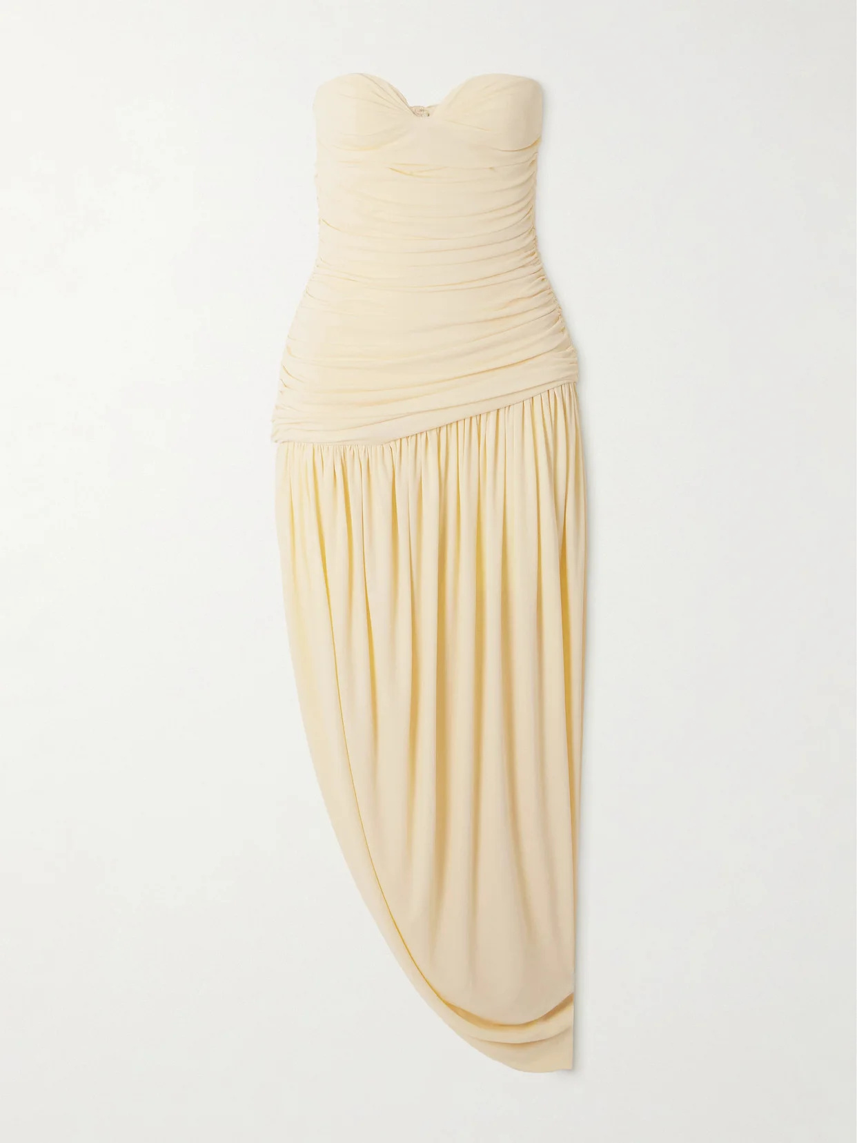 Debuted on the Fall '25 runway in Paris, Magda Butrym's midi dress captures modern, minimalist glamour with a focus on texture. It's made from crepe-jersey that's ruched throughout the slim bodice and falls to a draped skirt with a dramatic, leg-baring split. The sweetheart neckline frames your decolletage beautifully.