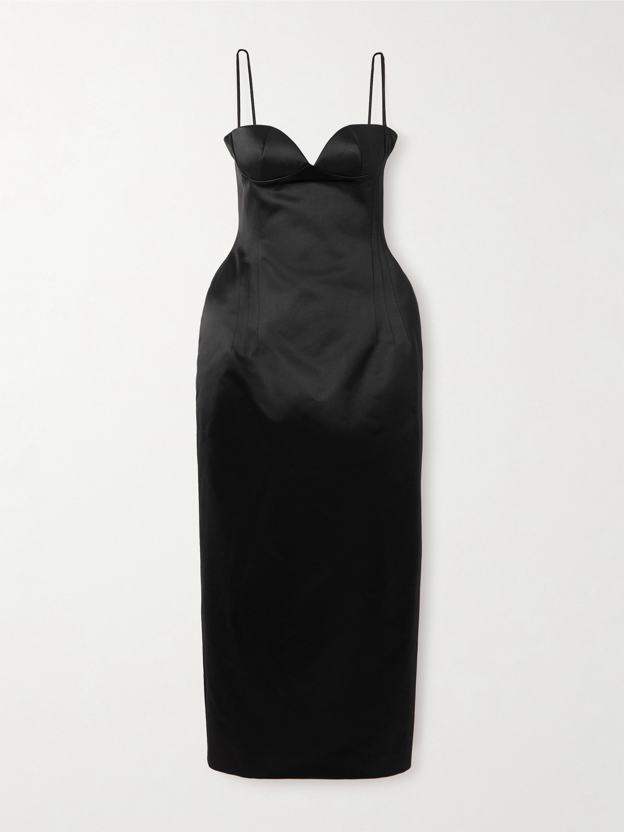 Magda Butrym's dress creates a sculptural hourglass profile courtesy of the boned bodice and defining hip pads. Made from lustrous satin blended with a hint of silk, it has molded cups and pin-thin straps. The dramatic split ensures you can move with ease.