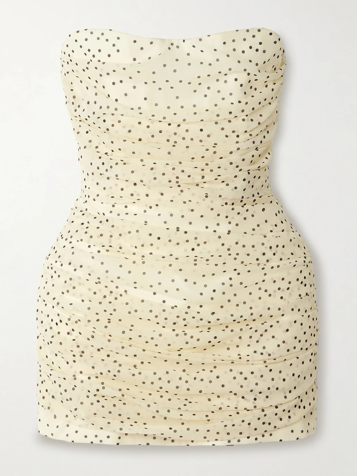 Strapless ruched silk mini dress in cream dots