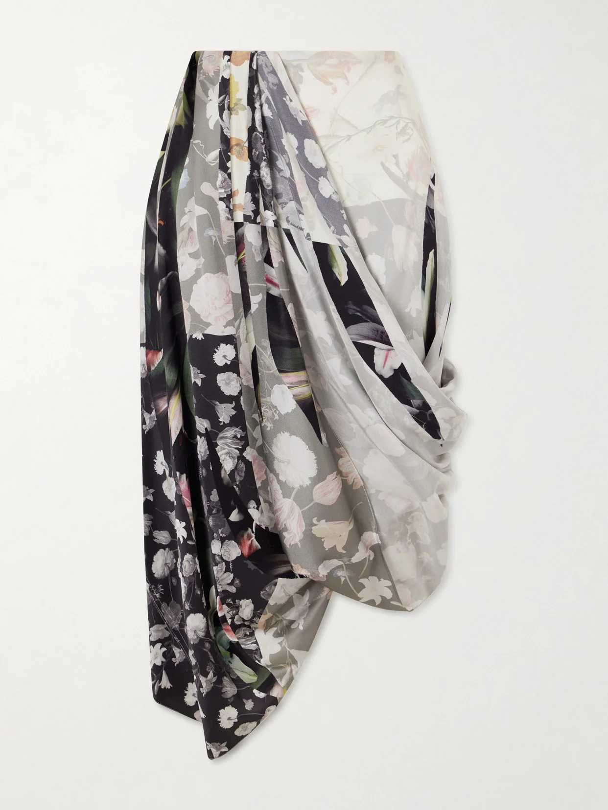 Asymmetrical Draped Floral-print Silk-satin Midi Skirt