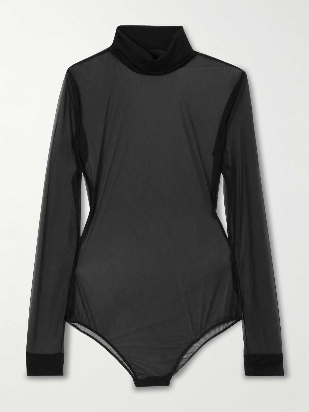 Underpin Maison Margiela's bodysuit with a bralette and it becomes the perfect base for layering. It's made from chiffon with a folded turtleneck and is embroidered with the house's signature four stitches at the nape.