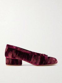 Ballet flats continue to be a key trend this season. If you're after a pair with a personality, you'll love Maison Margiela's pumps - the 'Tabi' split toe is a house signature and feels classic in the best way. They're made from distressed velvet and set on 30mm block heels. Size & Fit - Fits true to size, take your normal size - Italian sizing Details & Care - Heel measures approximately 30mm/ 1 inch - Burgundy velvet - Slip on