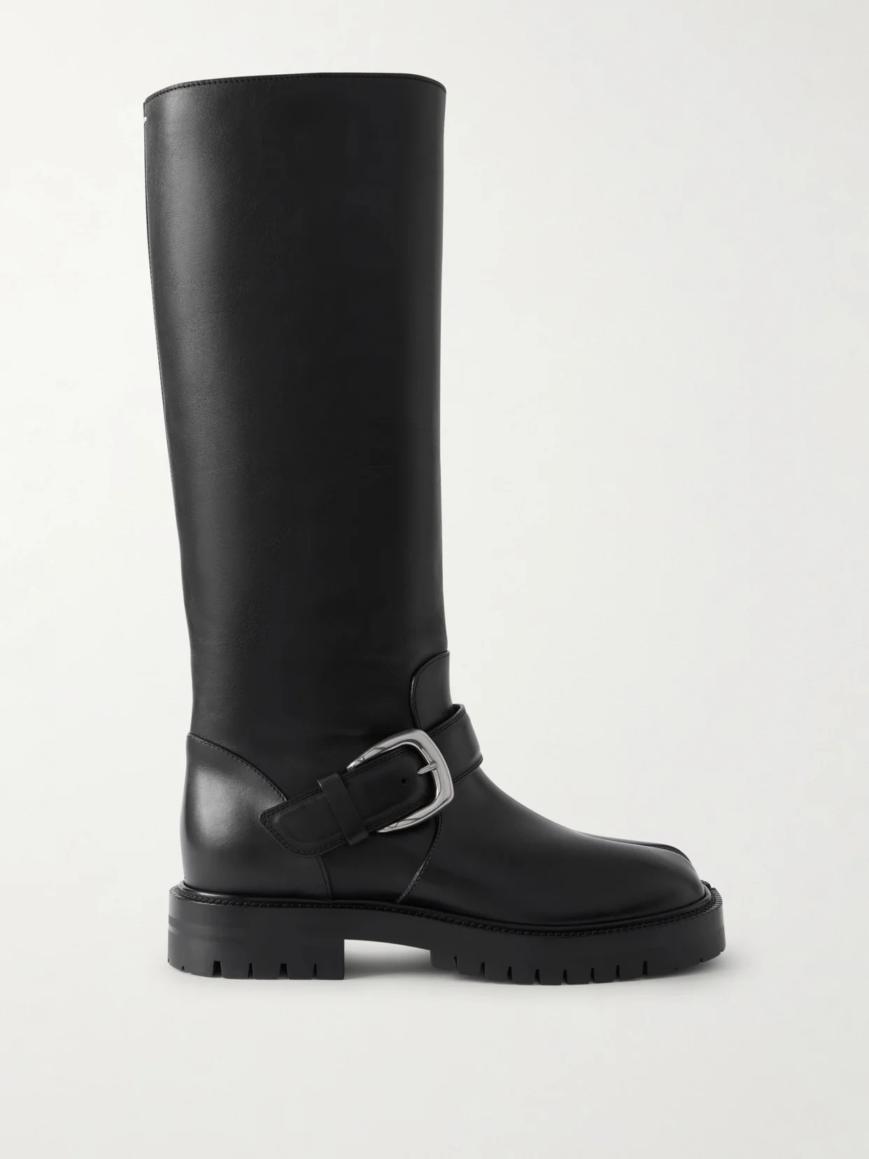 Maison Margiela's iconic ‘Tabi' boots feature the signature split toe, inspired by 15th-century Japanese footwear. Made from supple leather, they have silver-tone buckled straps and rest on durable rubber lugged soles for grip.