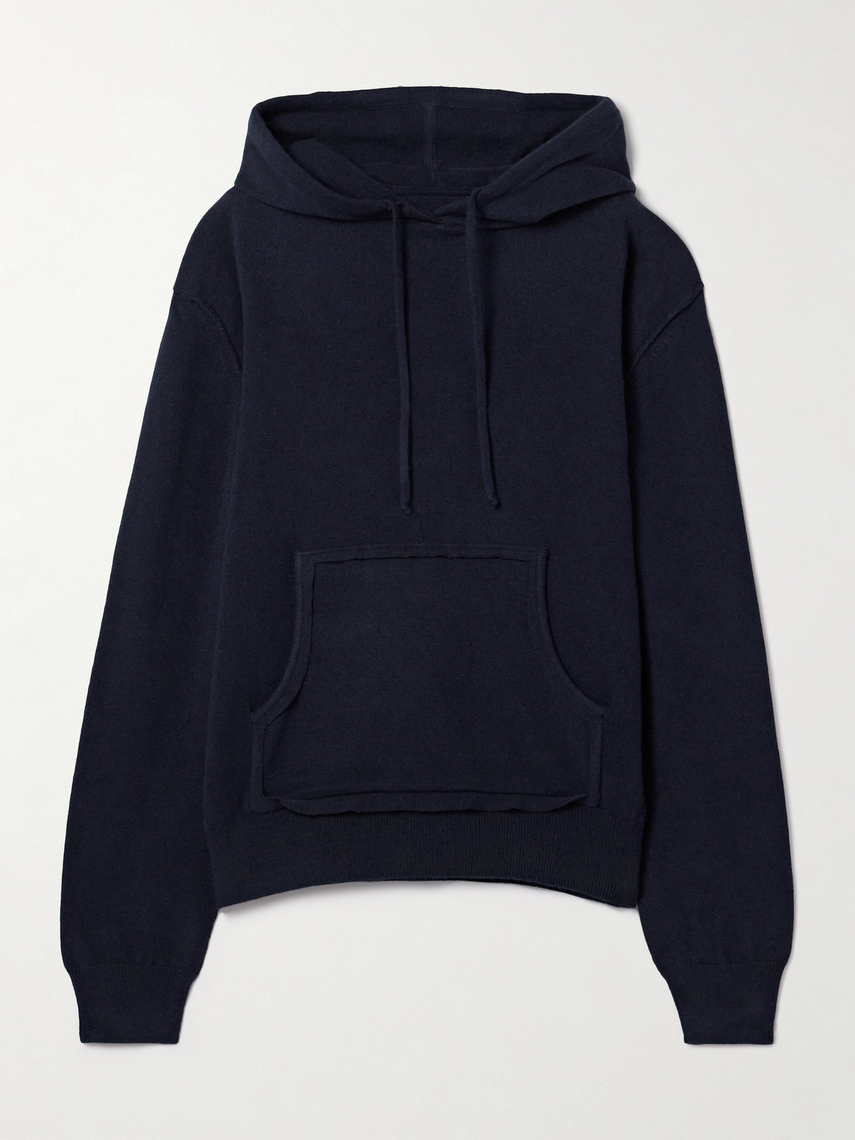 Maison Margiela's hoodie combines the comfort of loungewear with the luxurious feel of knitwear. Made from soft wool and cashmere-blend, it has a relaxed shape with dropped shoulders and a classic kangaroo pocket. The midnight-blue pairs especially well with inky tailoring.