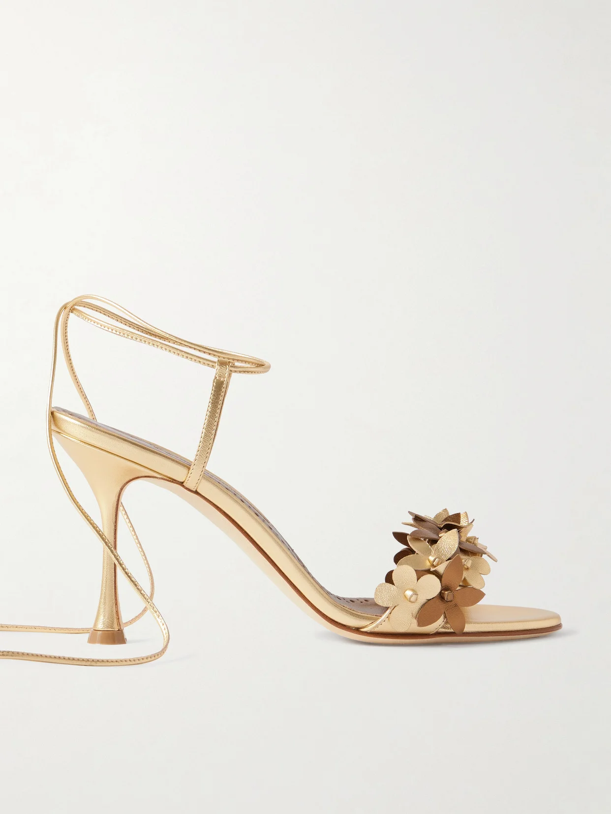Manolo Blahnik's ‘Anista' sandals draw inspiration from old Hollywood glamour. They've been made in Italy from metallic gold leather and are detailed with flowers appliqued along the slim strap. The fluted 90mm heels offer just the right amount of height, while the ankle ties ensure the perfect fit. Small to size. See Size & Fit notes.
