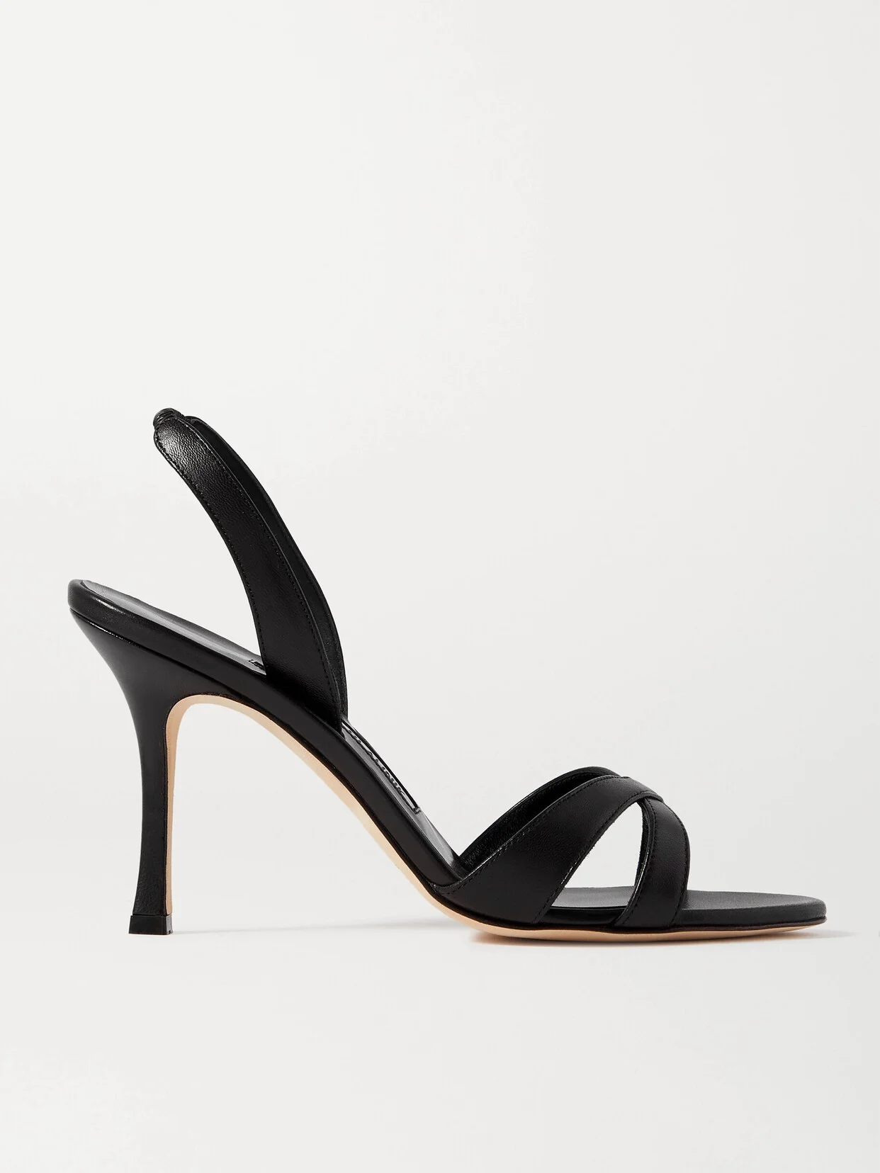The iconic Manolo Blahnik still takes a hands-on approach to each new collection - when not sketching, he's visiting factories (dressed in a lab coat with a pocketed silk handkerchief) to develop samples. These 'Callasli' sandals have been expertly crafted in Italy from supple black leather and have slender straps that cross neatly at the toes. The slingback band is elasticated at the center to keep it in place and the 90mm heels are gently fluted.