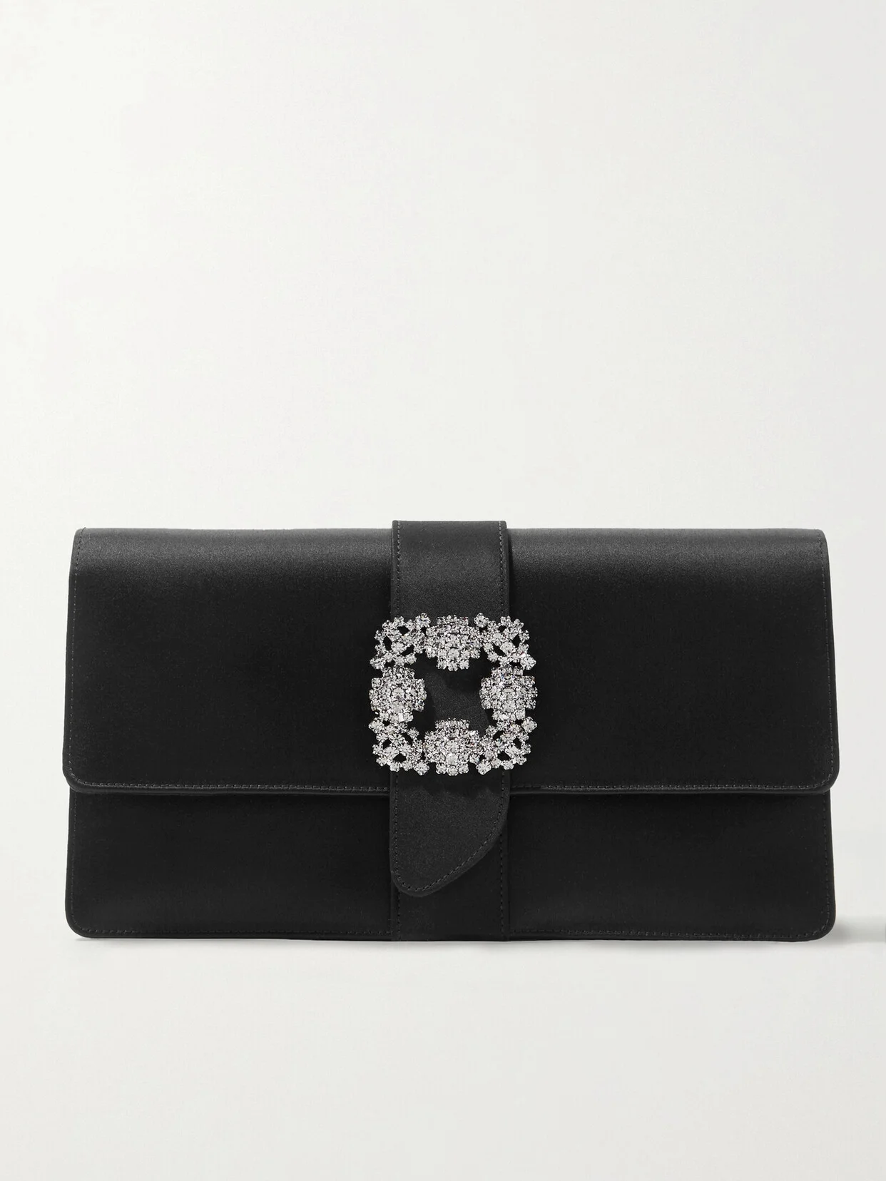 Manolo Blahnik's 'Capri' clutch is the perfect finishing touch for evening looks. It's made from lustrous satin and has a shimmering crystal-embellished buckle. The compact interior includes a slip pocket for your cards or cash, while the slim strap allows you to go hands-free.