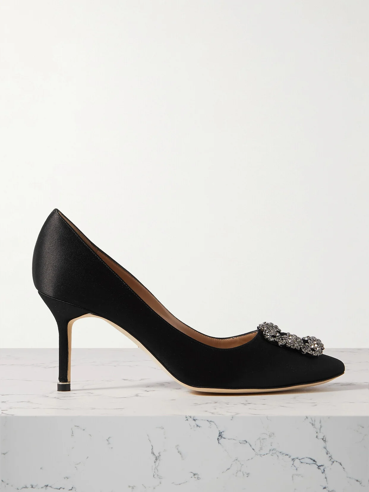 Manolo Blahnik's black satin 'Hangisi' pumps are truly timeless and iconic. They've been made at one of the designer's beloved factories in Italy, where he's often found developing samples and whittling lasts by hand. Lined and soled in leather, they have 70mm heels and are topped with the signature glistening buckle that first appeared in Spring '08 and has remained enduringly chic ever since.