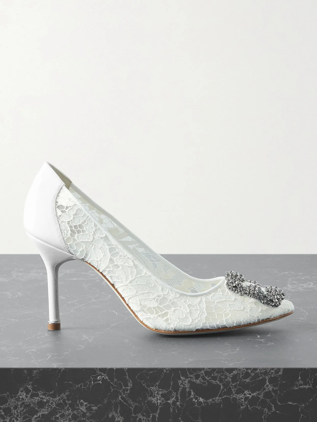 Manolo Blahnik's white corded lace 'Hangisi' pumps are truly timeless and iconic, so you'll wear them well beyond your wedding day. They've been made at one of the designer's beloved factories in Italy, where he's often found developing samples and whittling lasts by hand. Lined and soled in leather, they have 90mm heels and are topped with the signature glistening buckle that first appeared in Spring '08 and has remained enduringly chic ever since.