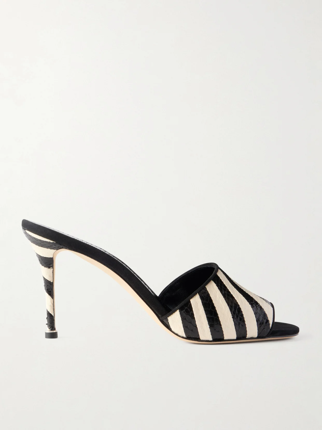 Jazz up your footwear collection with Manolo Blahnik's 'Larache' mules. They've been crafted in Italy from striped elaphe and have 90mm slender stilettos.