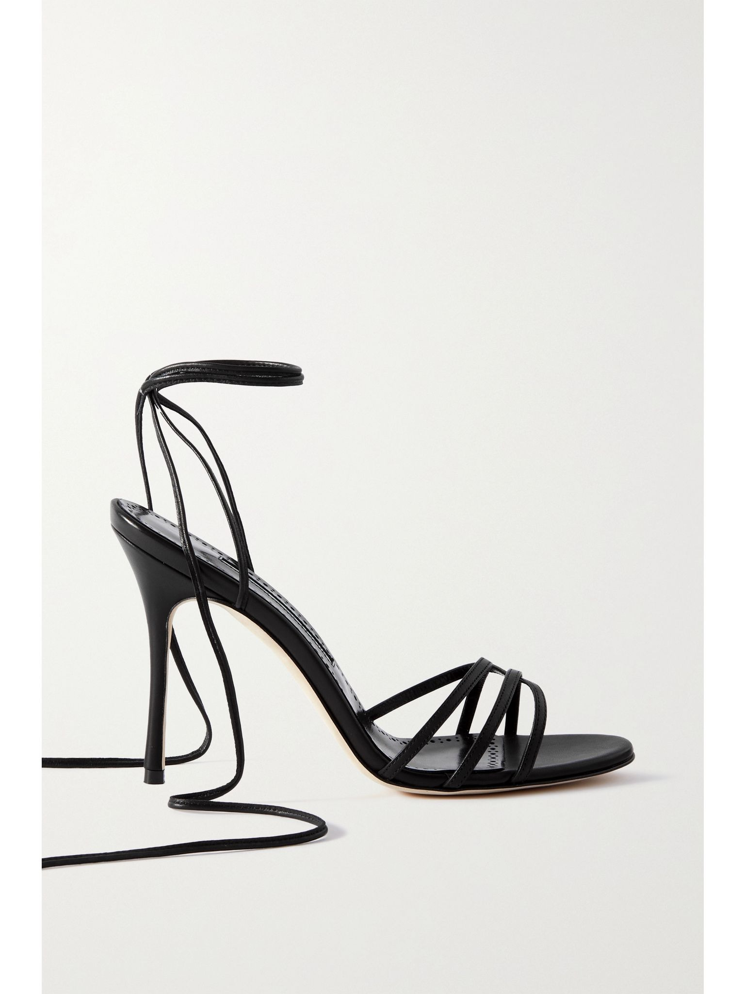 Consider Manolo Blahnik's 'Leva' sandals to be just as iconic (and timeless) as the little black dress. They've been handmade in Italy from leather and have soft ties at the ankle. Size & Fit - Fits true to size, take your normal size - Italian sizing Details & Care - Heel measures approximately 105mm/ 4 inches - Black leather (Lamb) - Ties at ankle