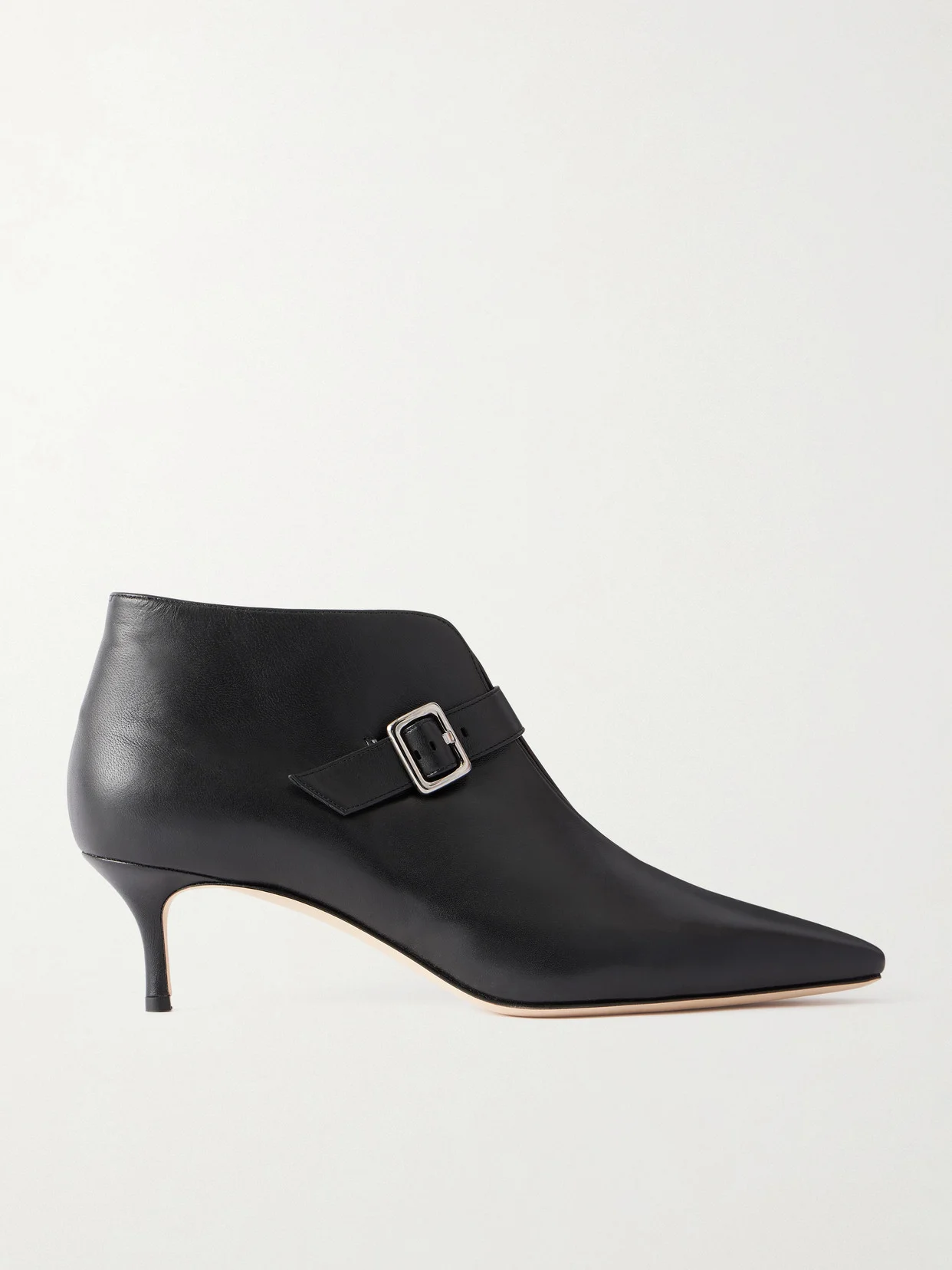 Manolo Blahnik's 'Mendiola' boots have a chic Mary Jane strap across the vamp. They're made from leather with a slim front cutout, 50mm kitten heels and elegant pointed toes. Small to size. See Size & Fit notes.