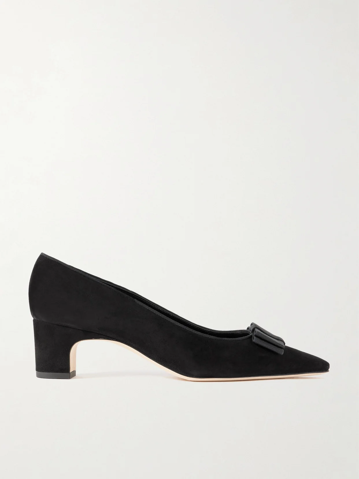 Manolo Blahnik's pumps are inspired by the founder's Spanish hometown, with bows that recall flags of toreadors giving them their name. Made from soft suede, they have graceful pointed toes and 50mm block heels.