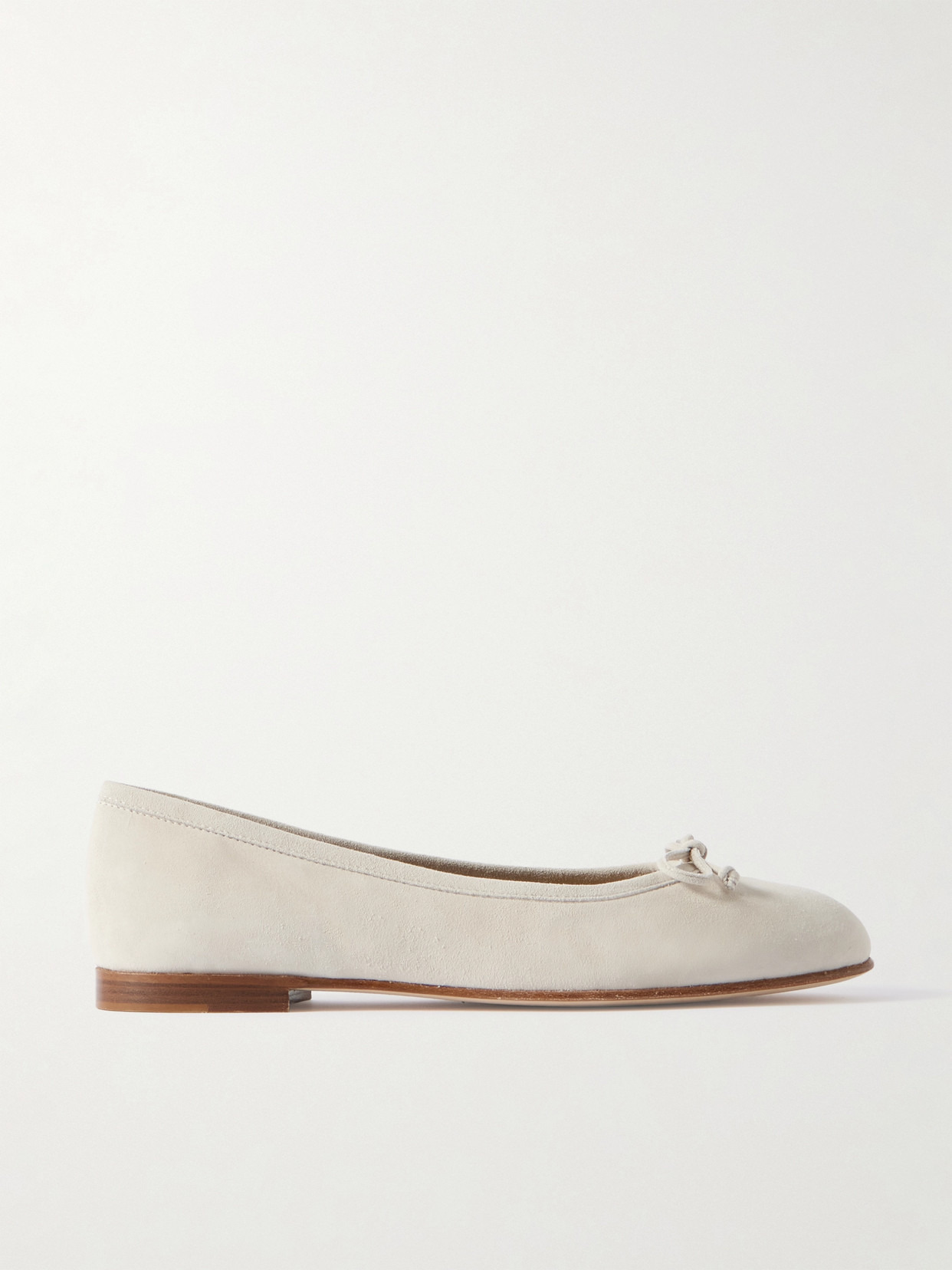 The ballet flat is officially back. Manolo Blahnik's pair has been made in Italy from soft suede and is detailed with rounded toes topped with a bow. Slip yours into your tote - you might need them after a day in heels.