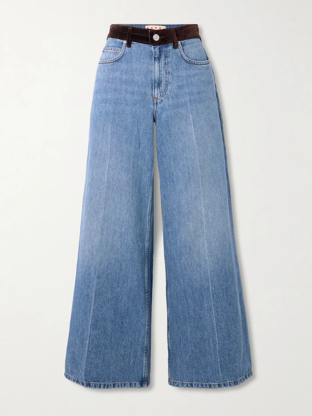 Appliquéd Velvet-trimmed Wide-leg Jeans
