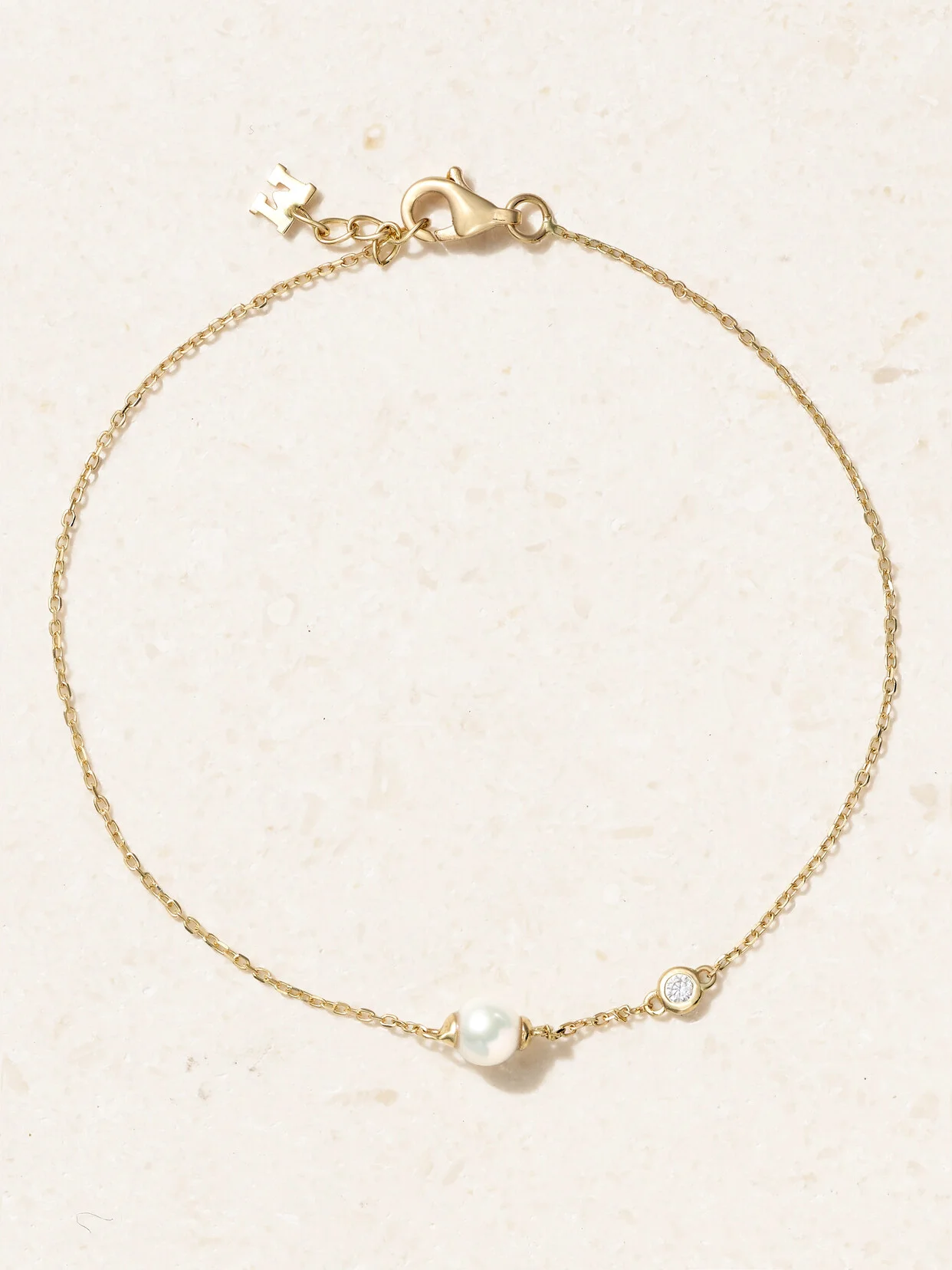 Simplicity is the foundation of elegance;"" says New York-based jeweler Matthew Harris - the Mateo founder often finds inspiration in modern art. This dainty bracelet is cast from 14-karat gold and has a glistening pearl suspended at the center. Notice the round-cut diamond in a white gold setting twinkling to one side.