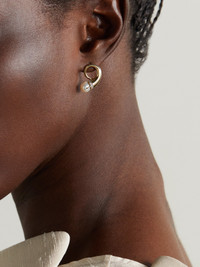 Mateo's earrings are designed in a swirling shape to look like a 'Cornucopia', which also serves as a symbol of abundance. They've been handmade in New York City from 14-karat gold and are tipped with lustrous peals that sit atop a band of sparkling diamonds.