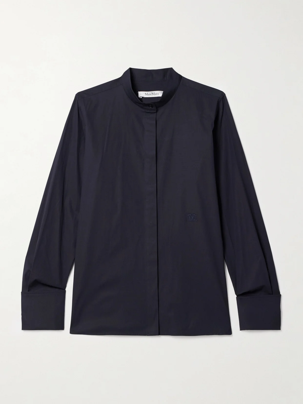 Max Mara's 'Arduino' shirt is modeled on sophisticated menswear. It's tailored from crisp cotton-blend poplin and has a mandarin collar, double cuffs and the brand's emblem embroidered in tonal threads at the front.